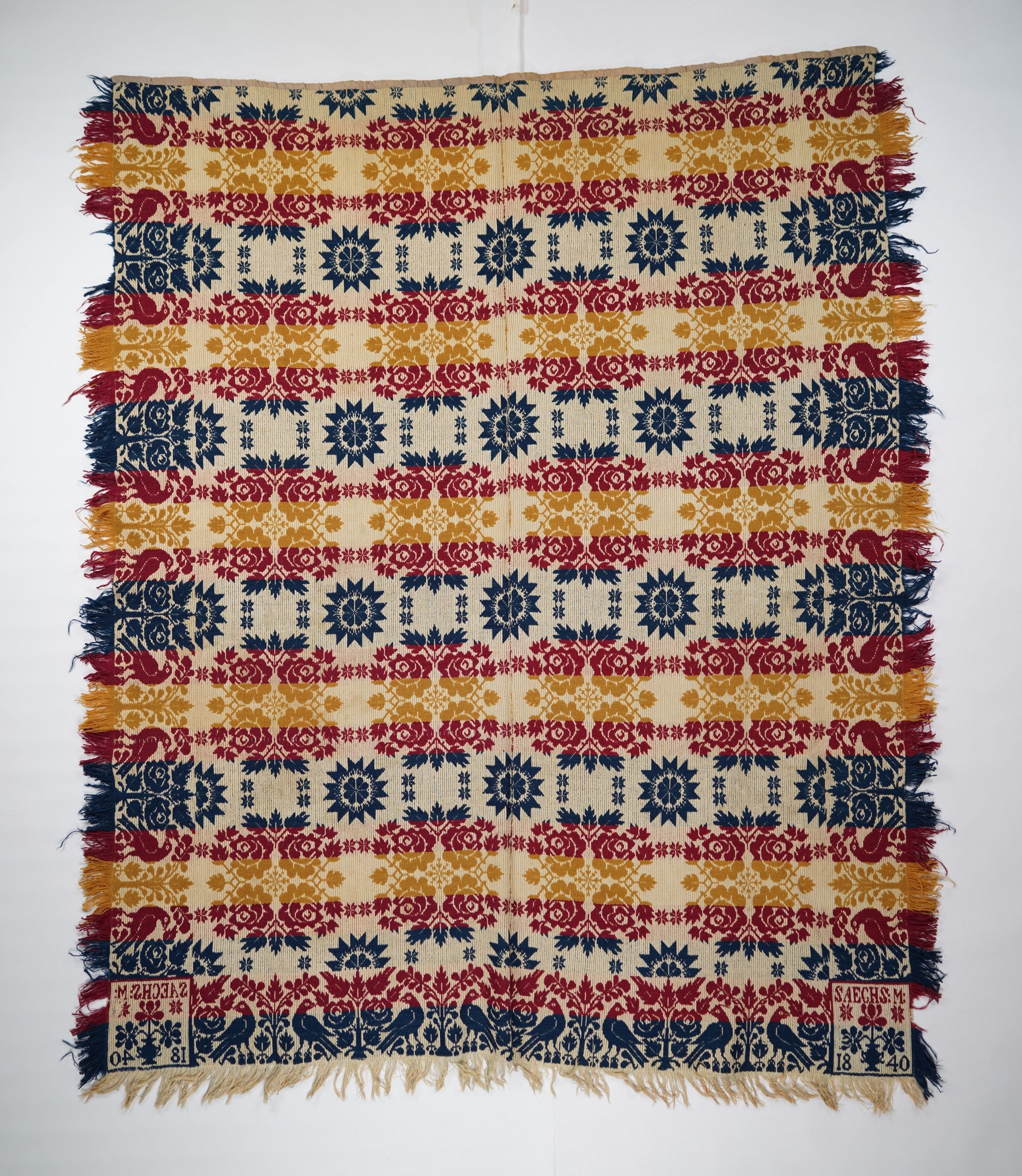 Yellow, red, navy, and natural figured tied half doublecloth coverlet with border and self-fringe on three sides. Two joined panels. Woven by or for M. Saechs in 1840.Collection