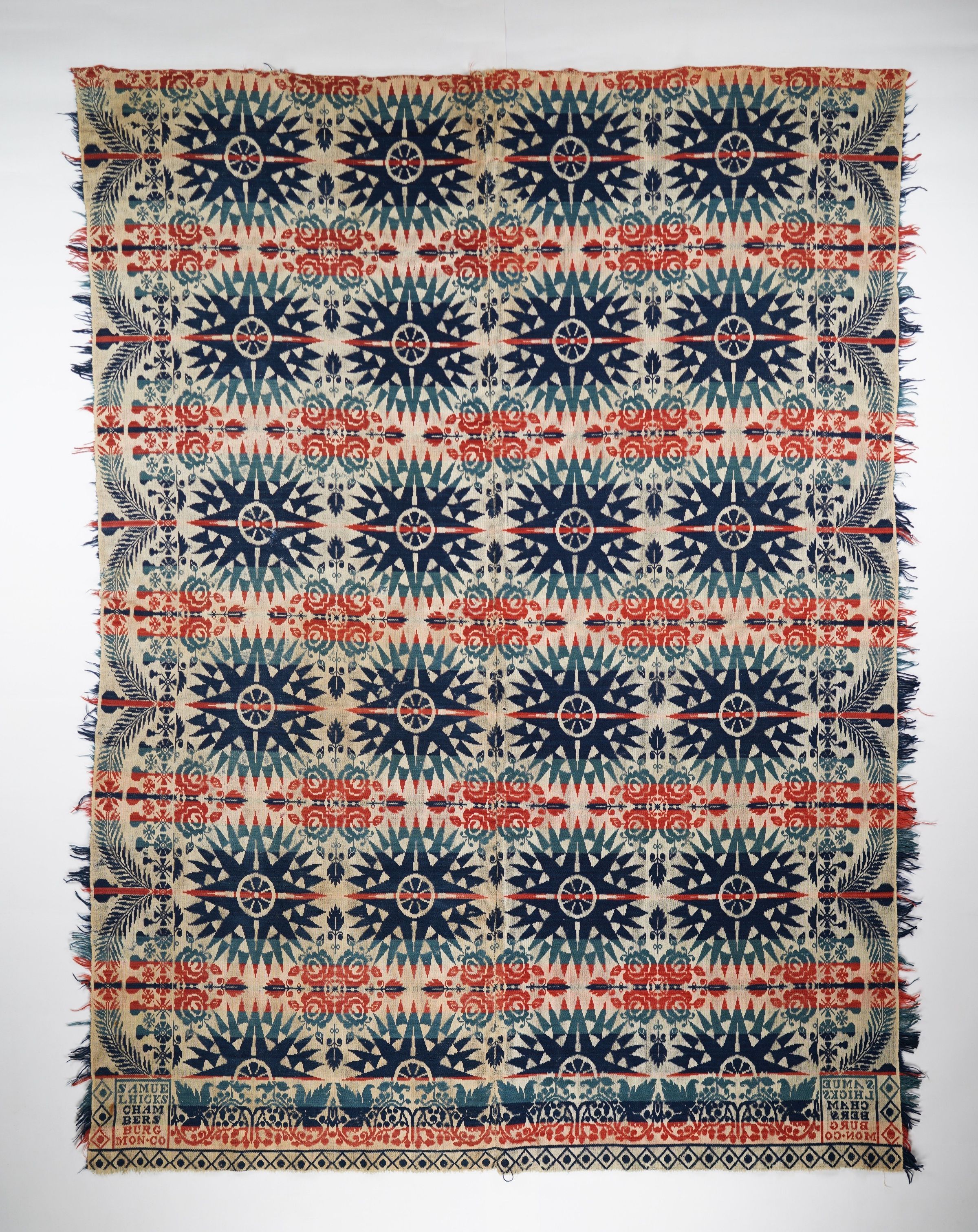 Blue, navy, red, and natural figured tied beiderwand coverlet with border on three sides and self-fringe on two sides. Woven by Samuel Hicks in Chambersburg, Montgomery Co., Ohio.Context