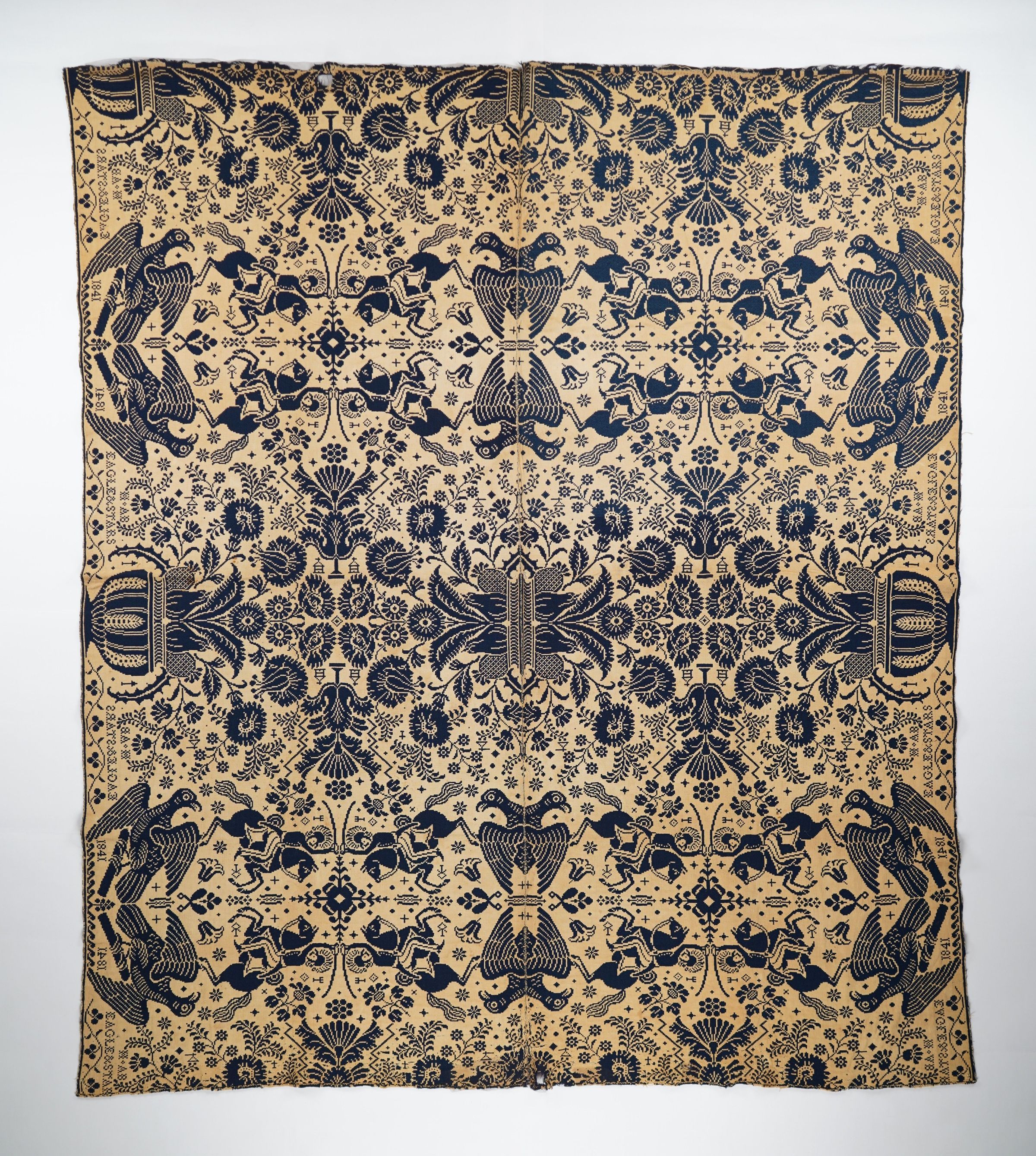 Navy and natural figured doubleweave with border on two sides. Two joined panels. "Eagle & Stars" pattern dated 1841 with initials HAB.Context