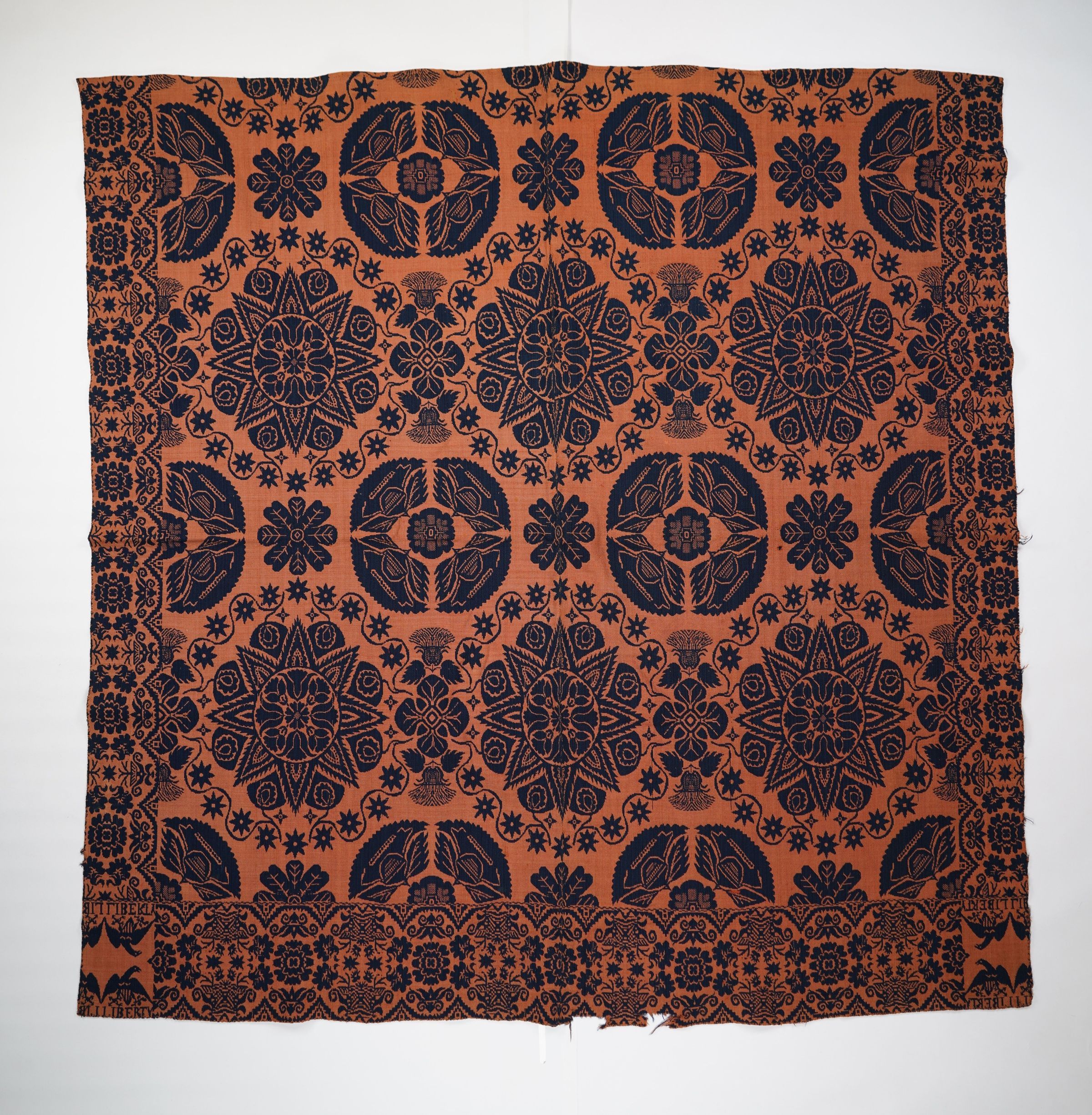 Red and navy figured doubleweave coverlet with border on three sides. Two joined panels.Collection