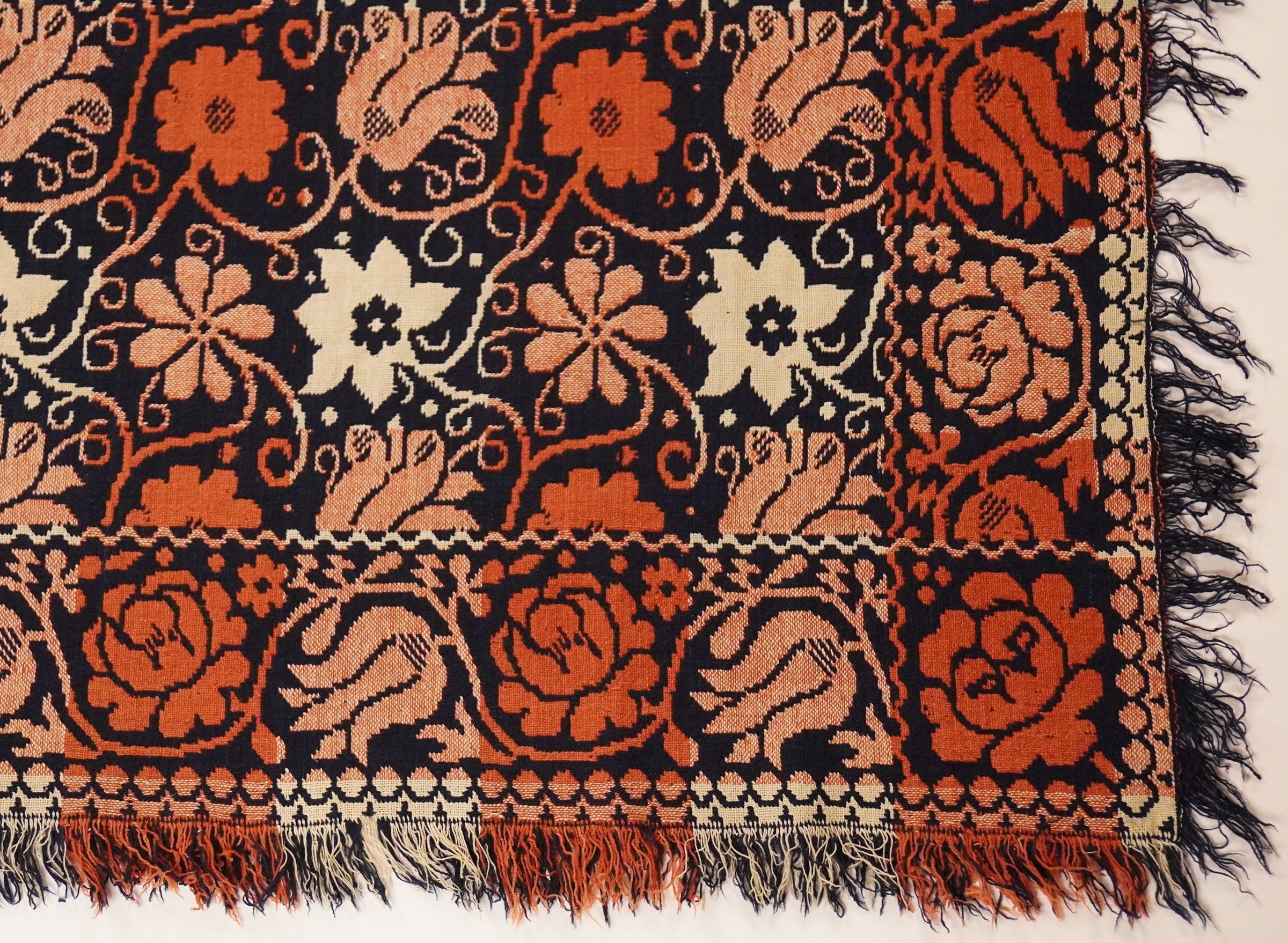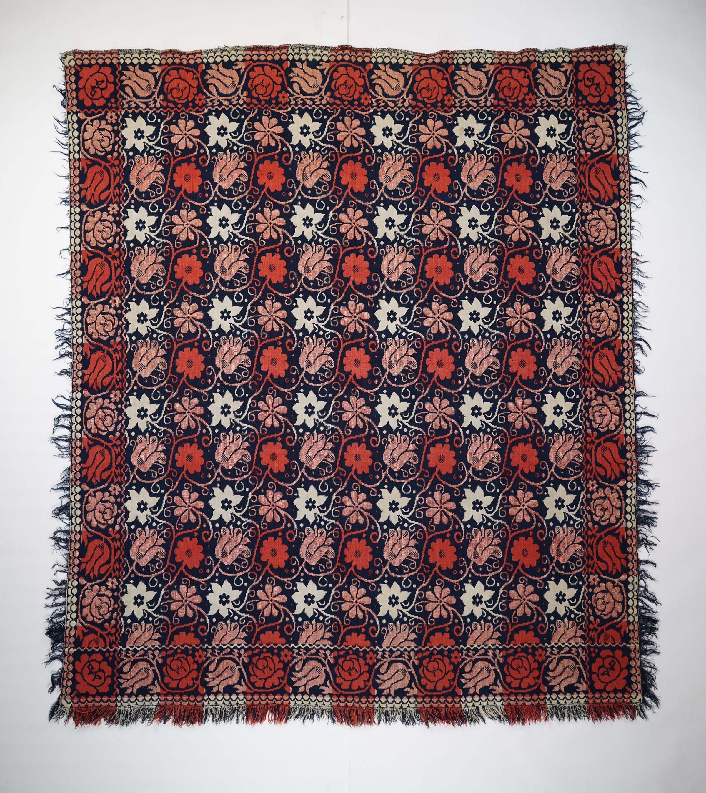 Red, navy, and natural figured double weave coverlet with border on four sides and self-fringe on three sides. Seamless.