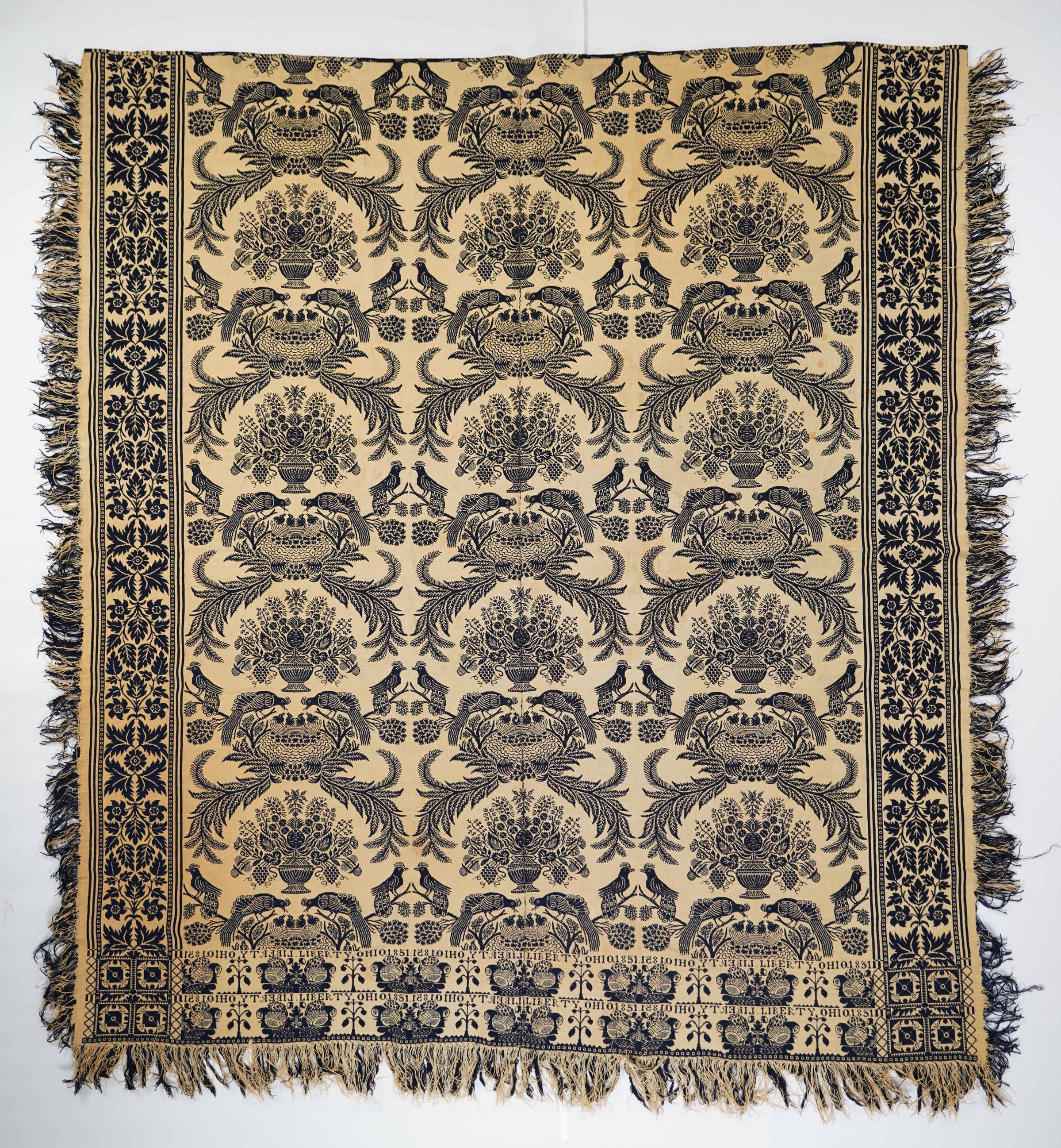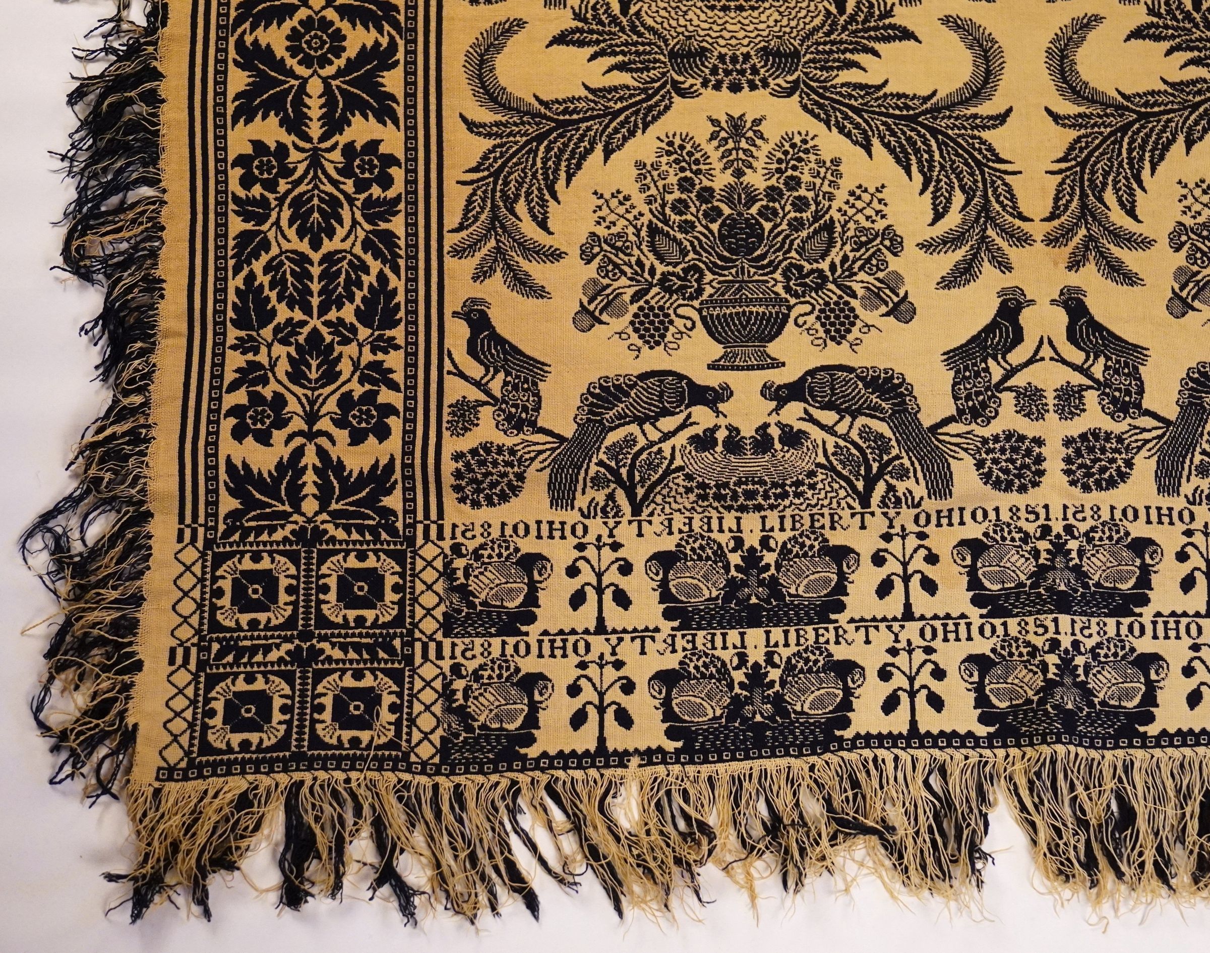 Natural and navy figured double weave coverlet with self-fringe and border on three sides. Two joined panels. The bottom border reads "LIBERTY OHIO 1851."Collection