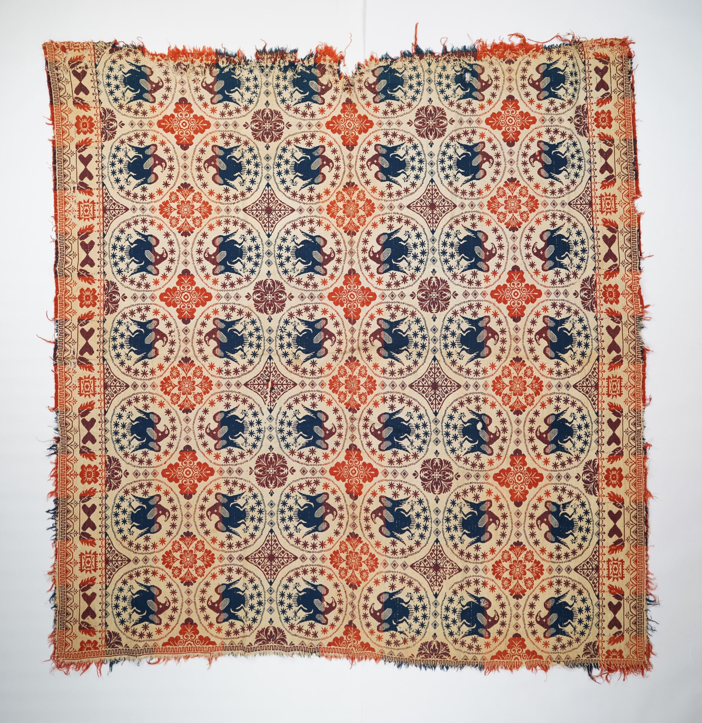 Red, navy, and natural figured double weave coverlet with border on left and right. Two joined panels.