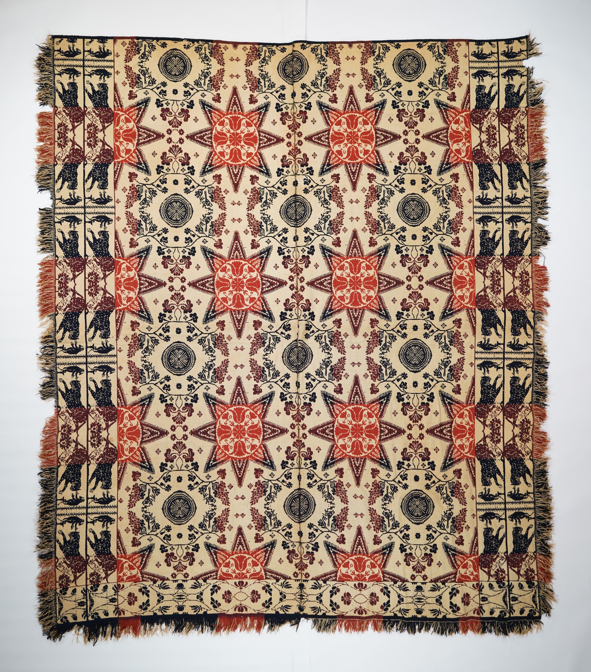 Red, navy, and natural figured double weave coverlet with border and self-fringe on three sides. Two joined panels.