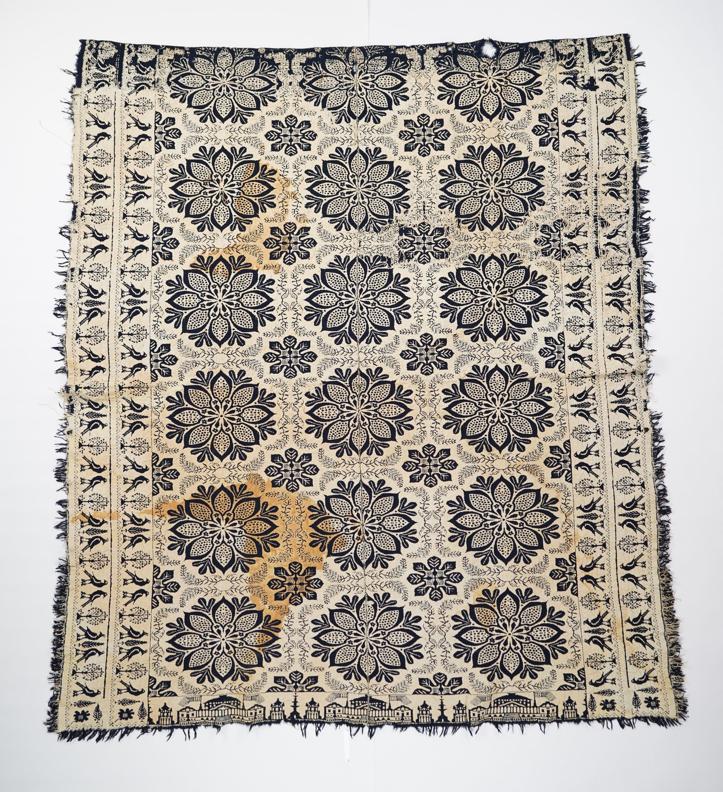 Navy and natural figured double weave coverlet with border and self-fringe on three sides. Two joined panels.