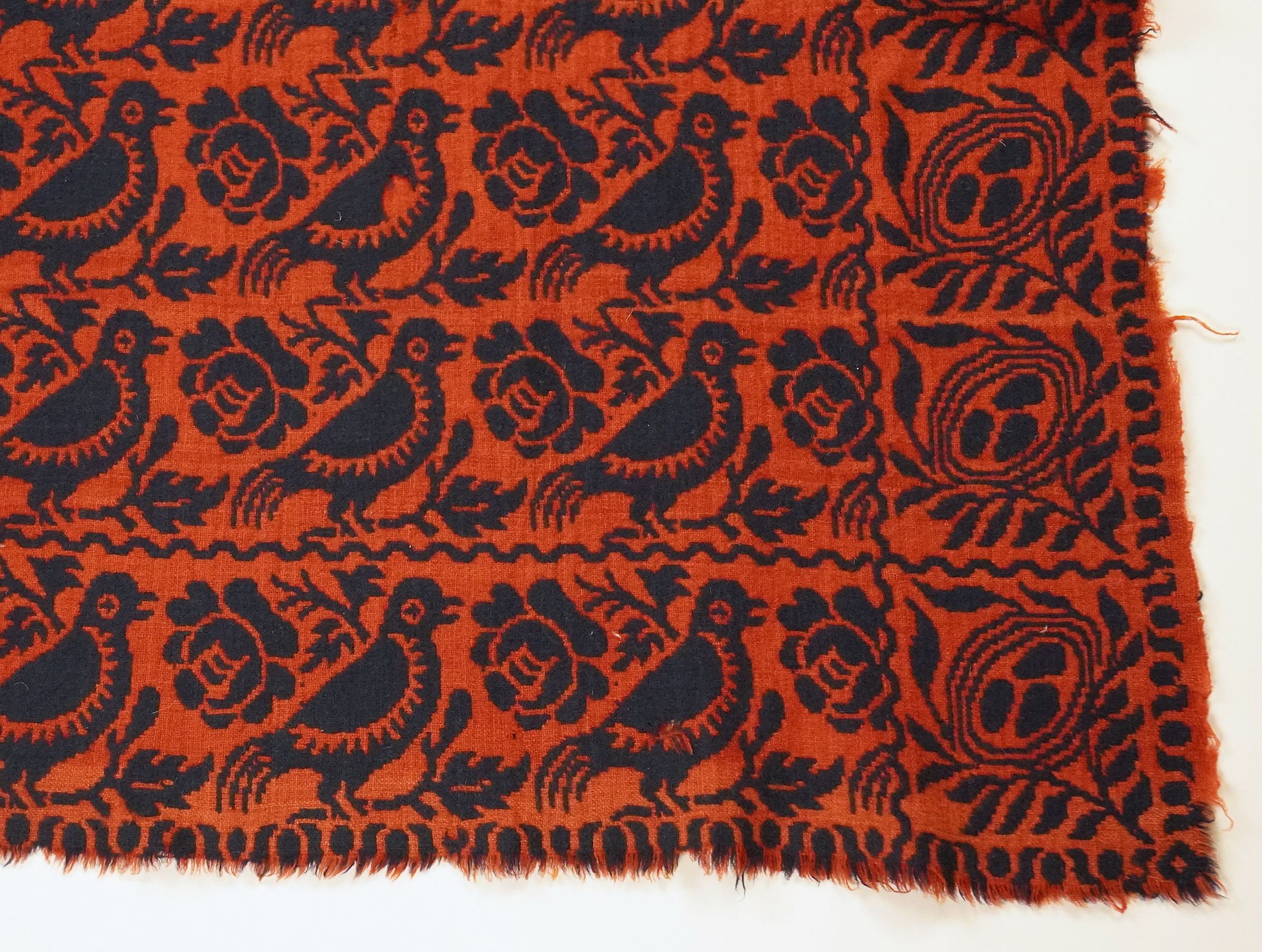 Red and navy figured double weave coverlet with border on three sides. Seamless.