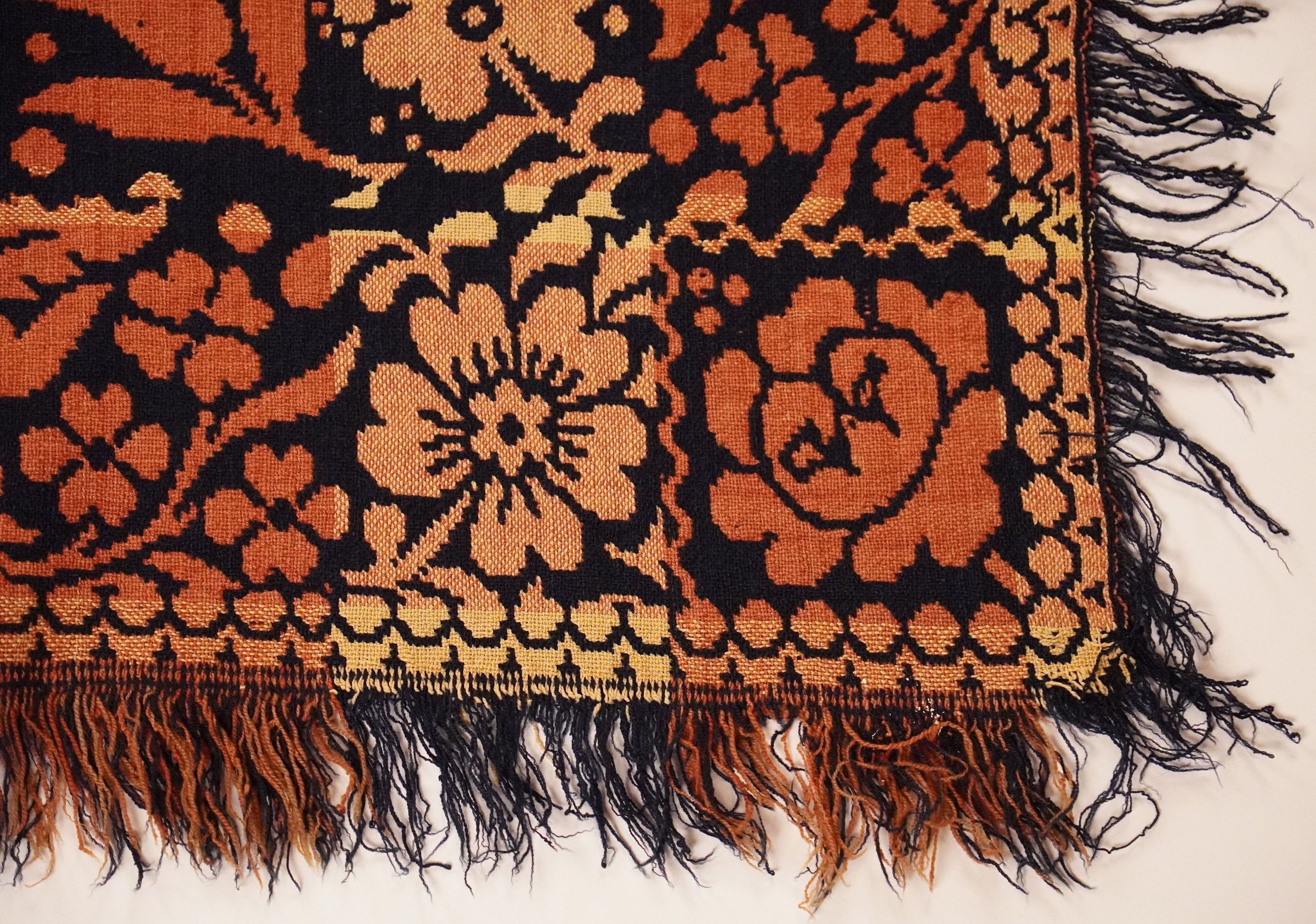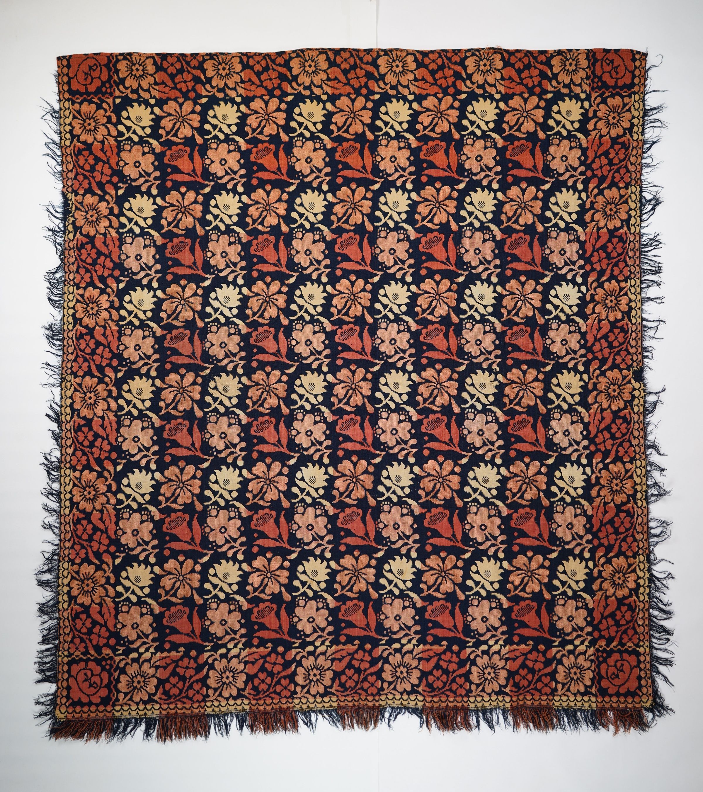 Red, navy, and natural figured double weave coverlet with border on four sides and self-fringe on three sides. Seamless.