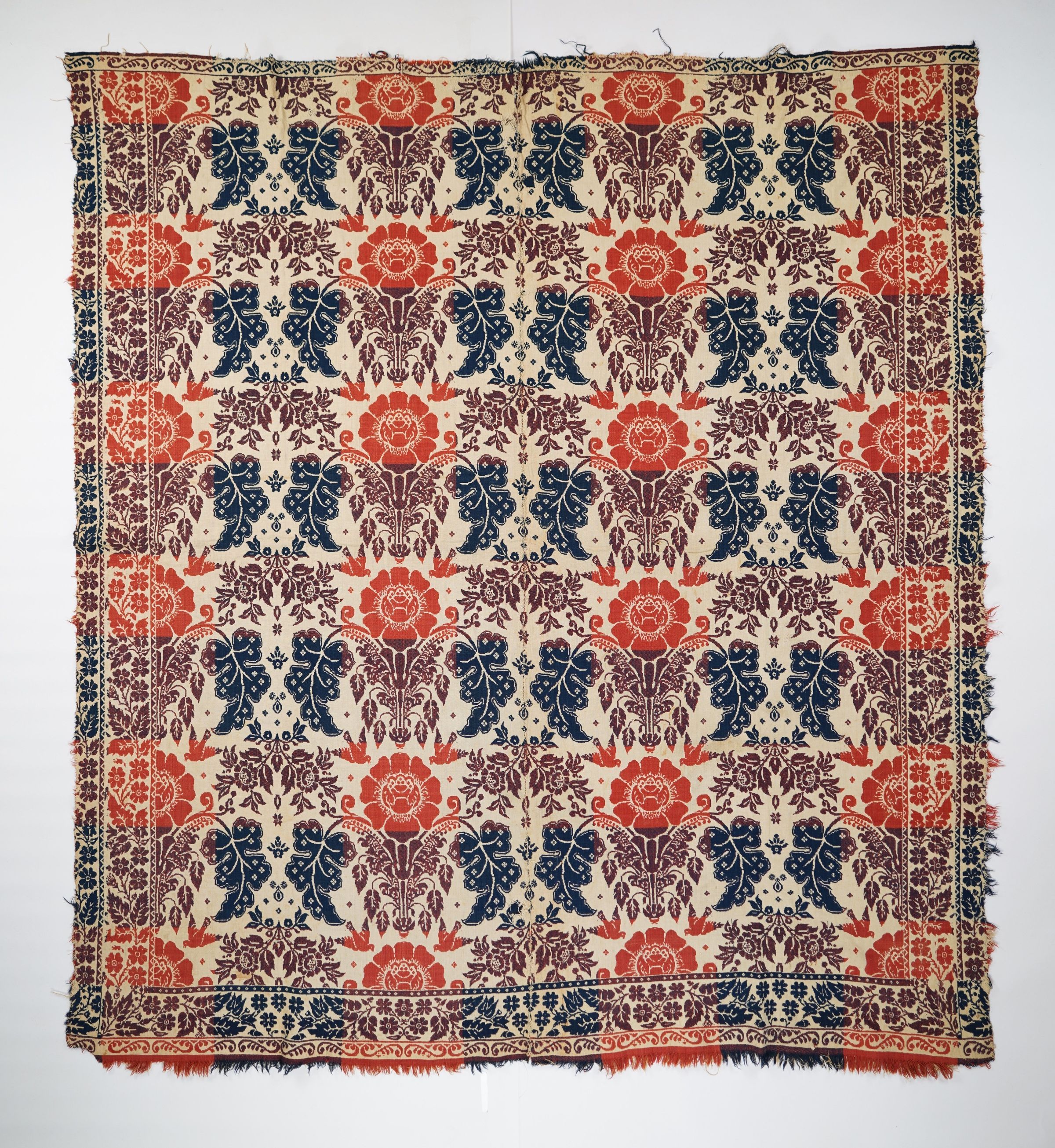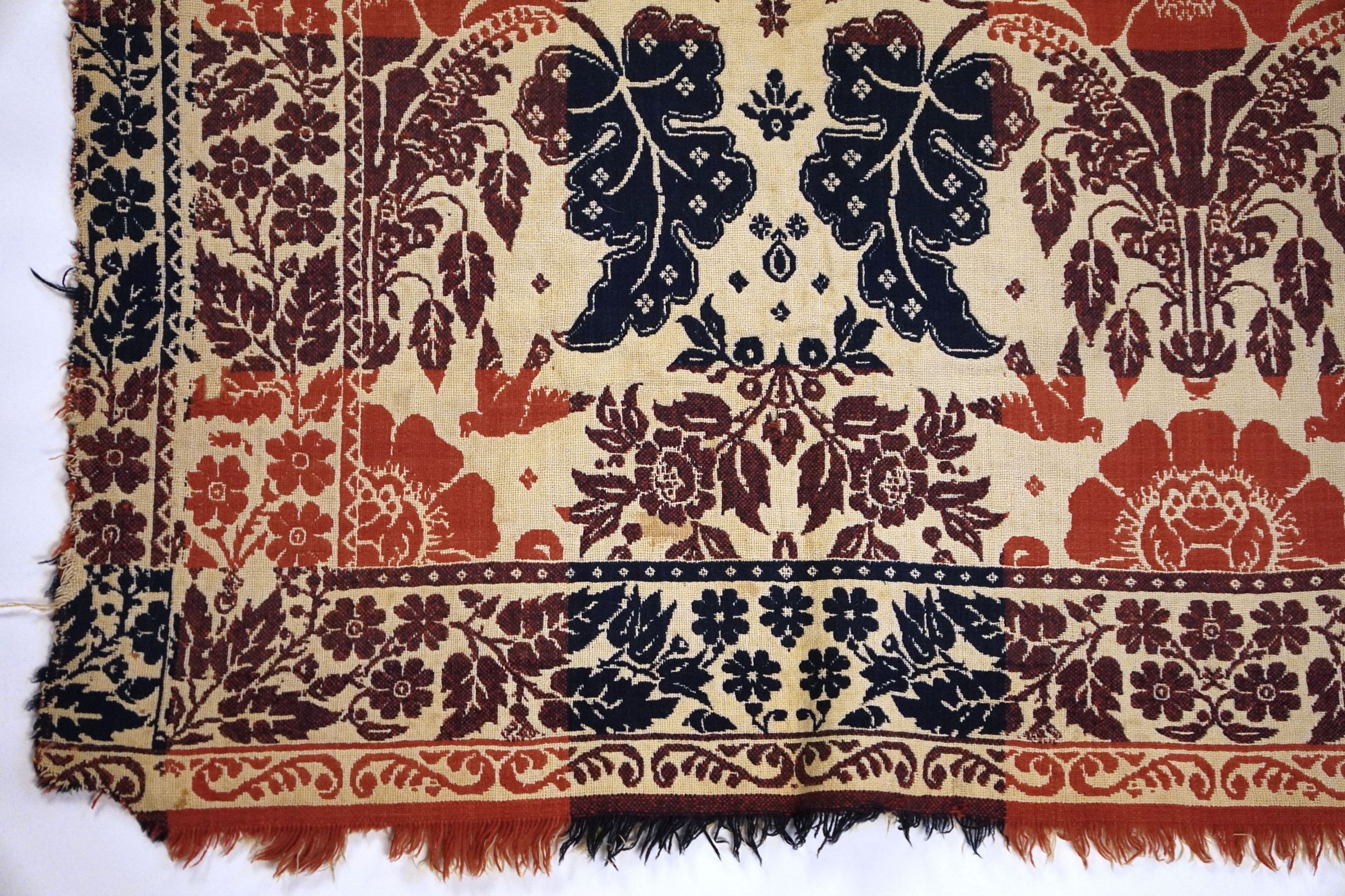 Red, navy, and natural figured double weave coverlet with self-fringe along bottom and floral border on three sides. Two joined panels.Collection
