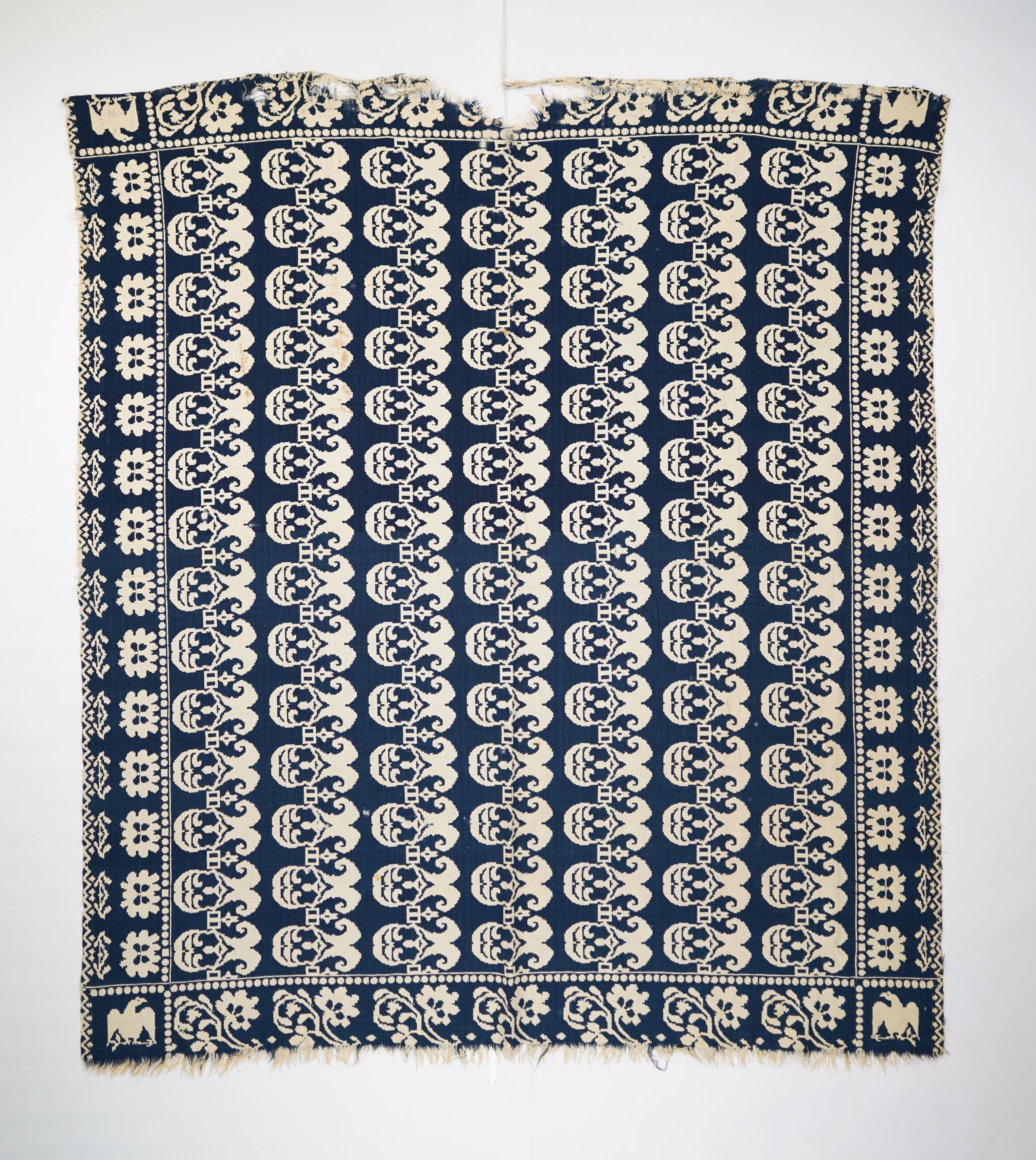 Navy and natural figured double weave coverlet with border on four sides. Seamless.