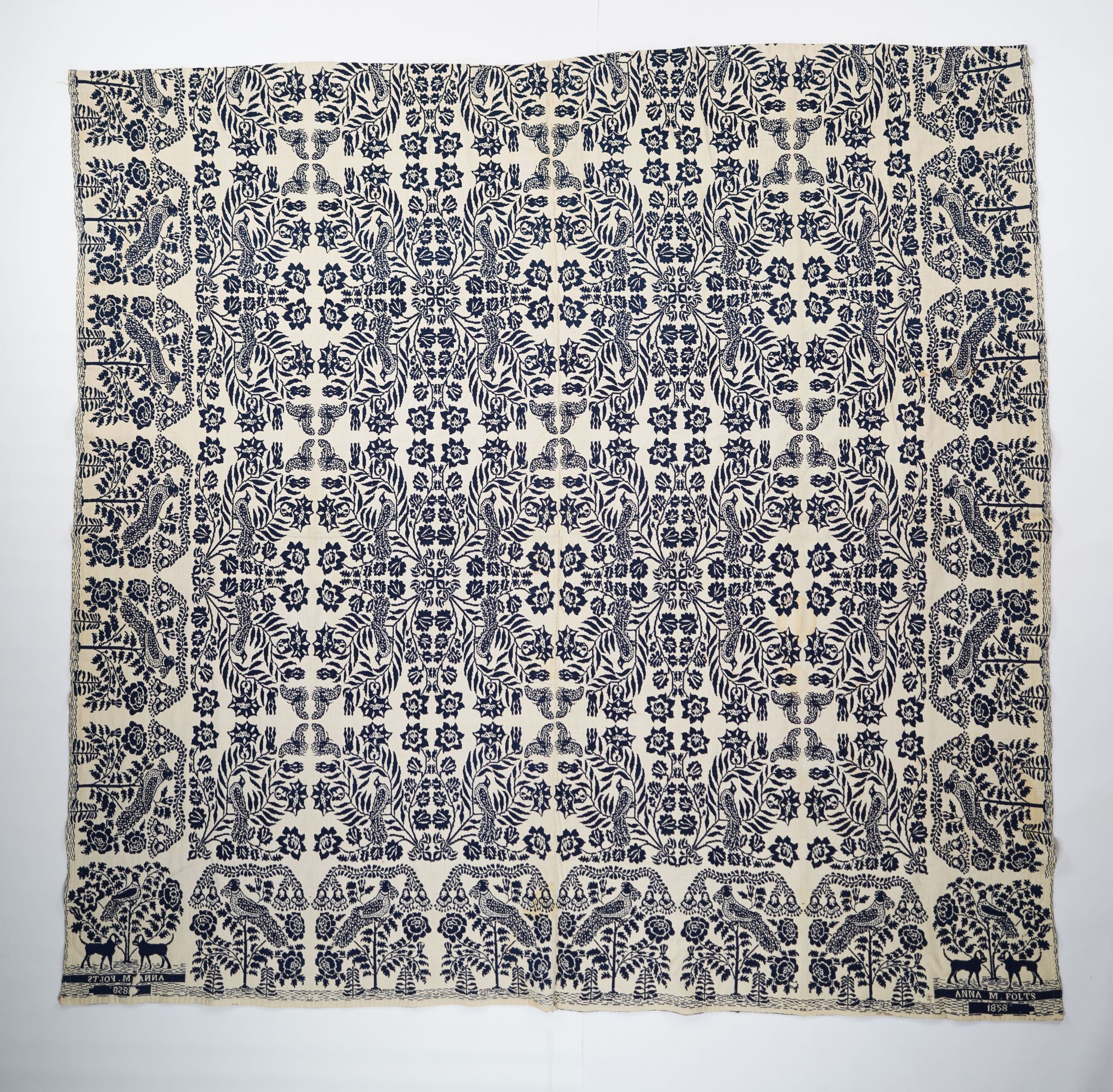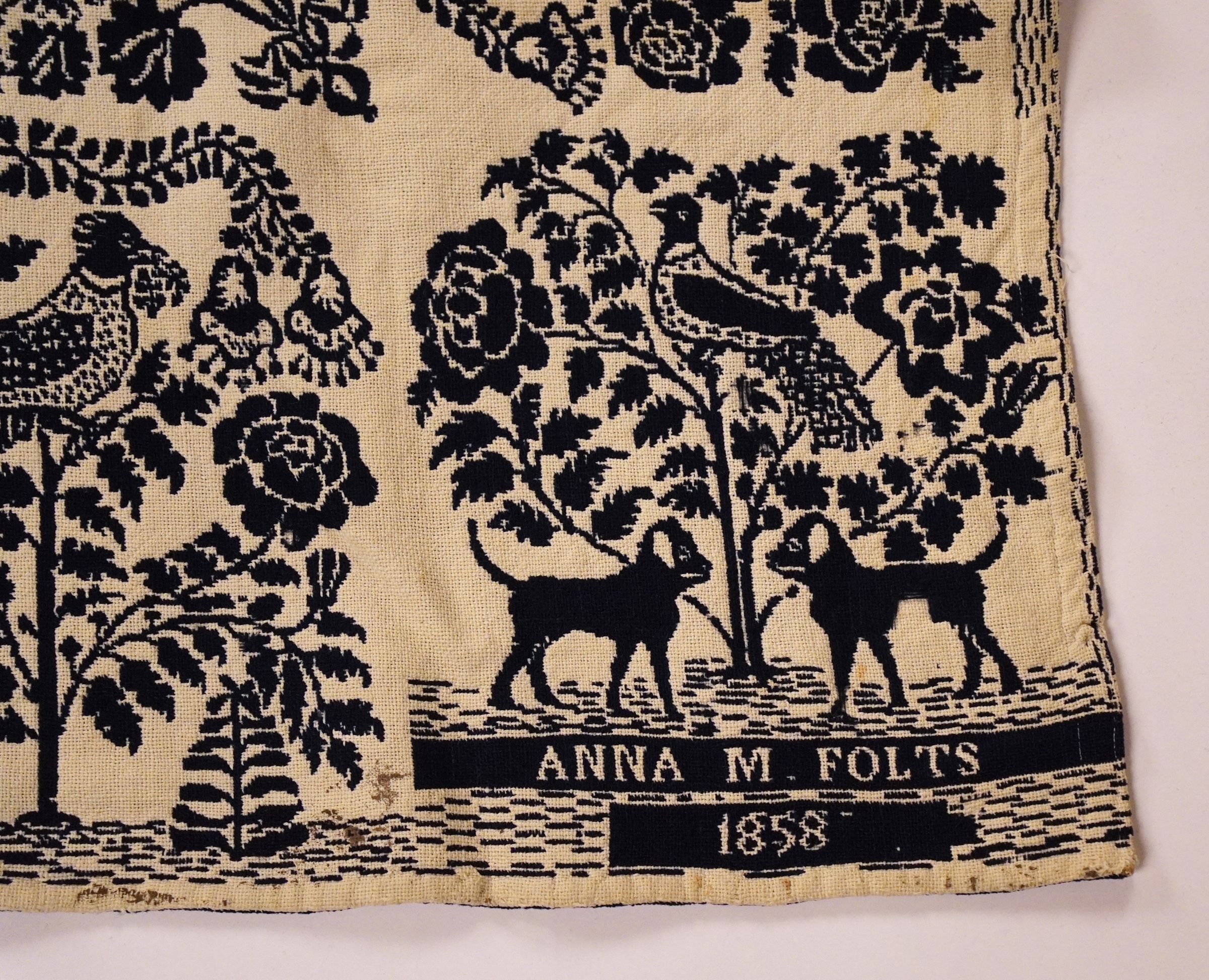 Navy and natural figured double weave coverlet with bird in tree border on three sides. Woven for Anna M. Folts in 1878.Collection