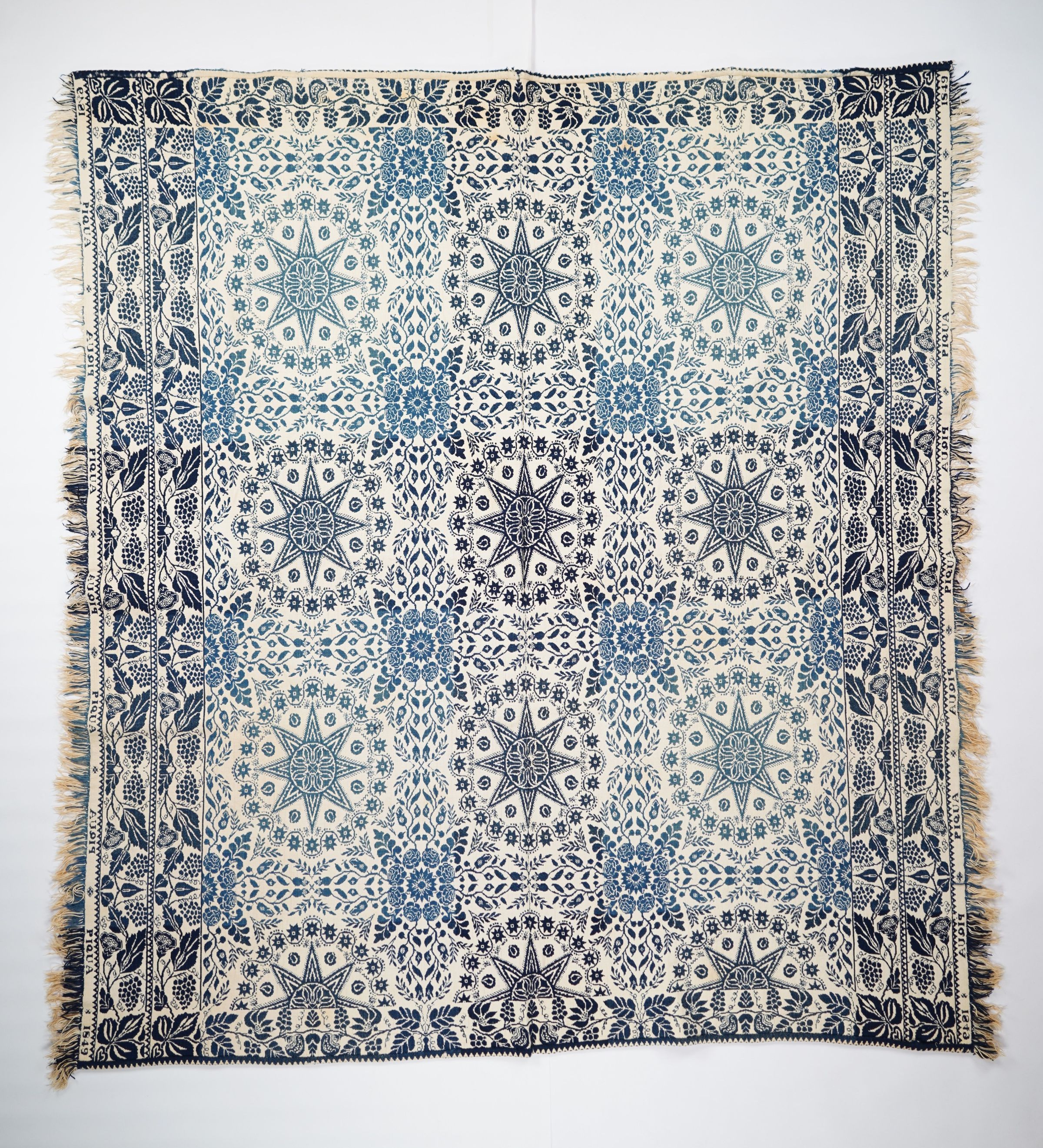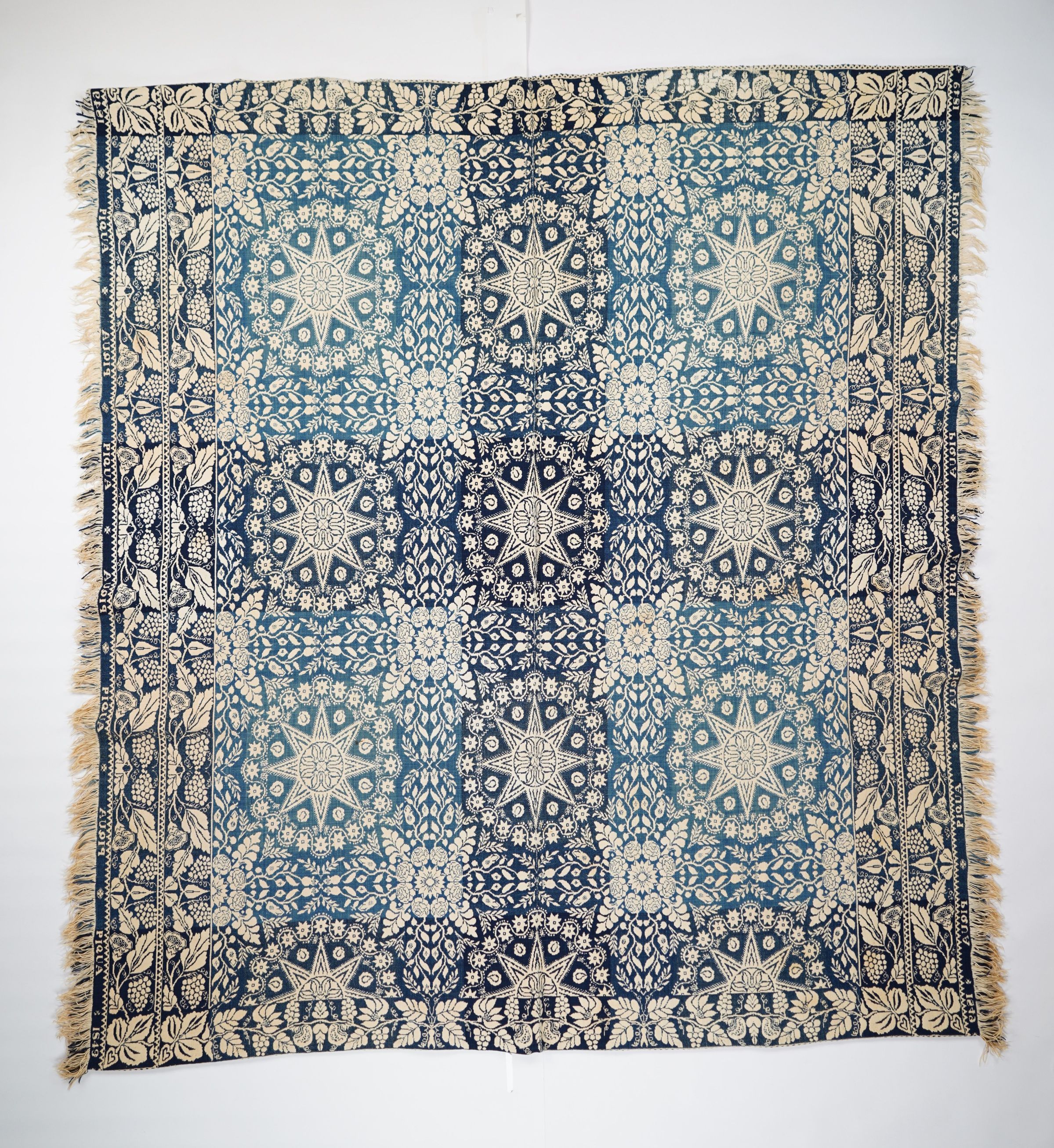 Blue, navy, and natural figured double weave coverlet with border on four sides and self-fringe on left and right sides. Two joined panels. Woven in Piqua, Miami Co., Ohio in 1849.Collection