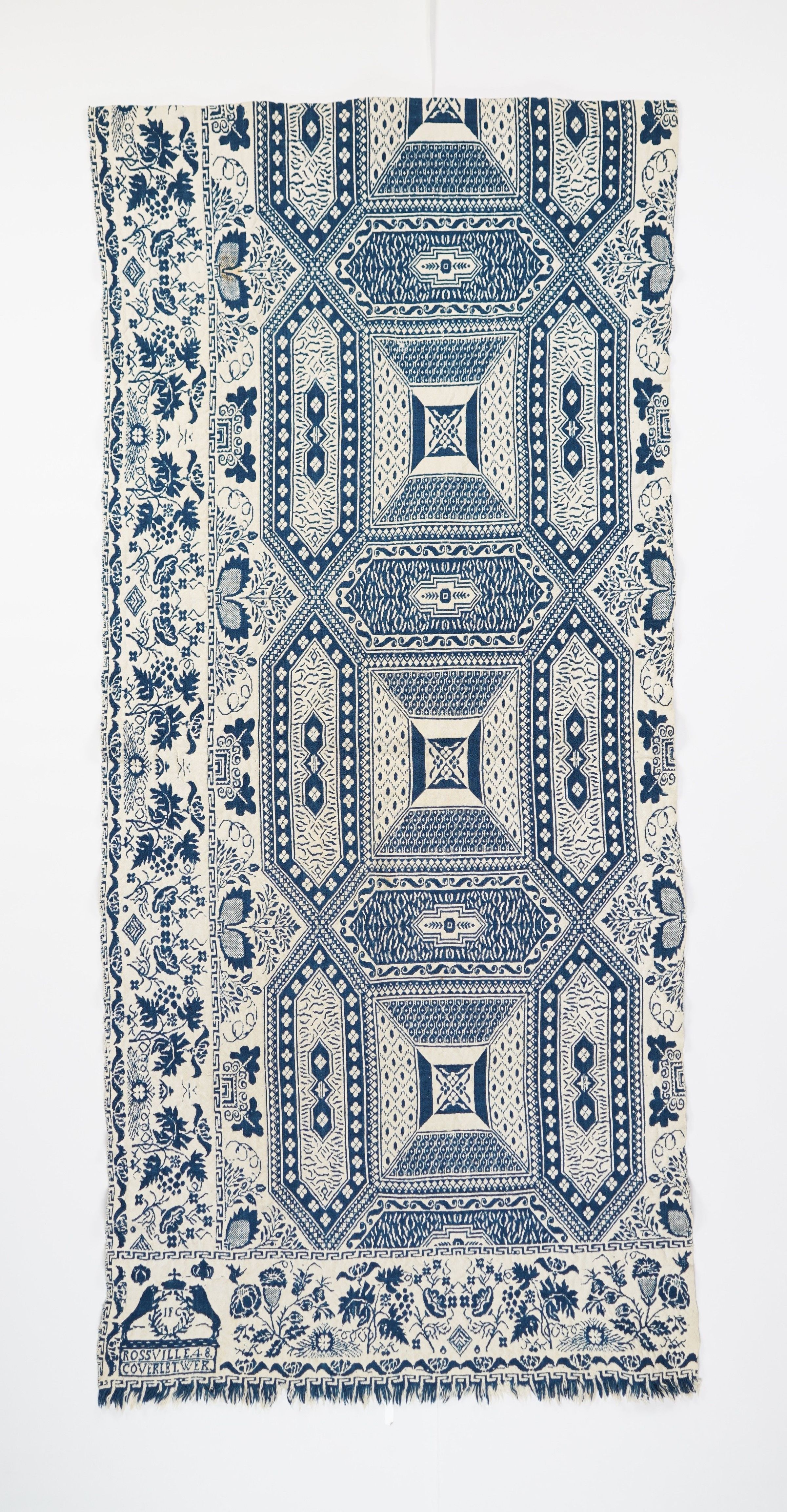 Navy and natural figured double weave coverlet with border on two sides and self-fringe along bottom. One panel. Woven in Rossville, Ohio in 1848.Collection