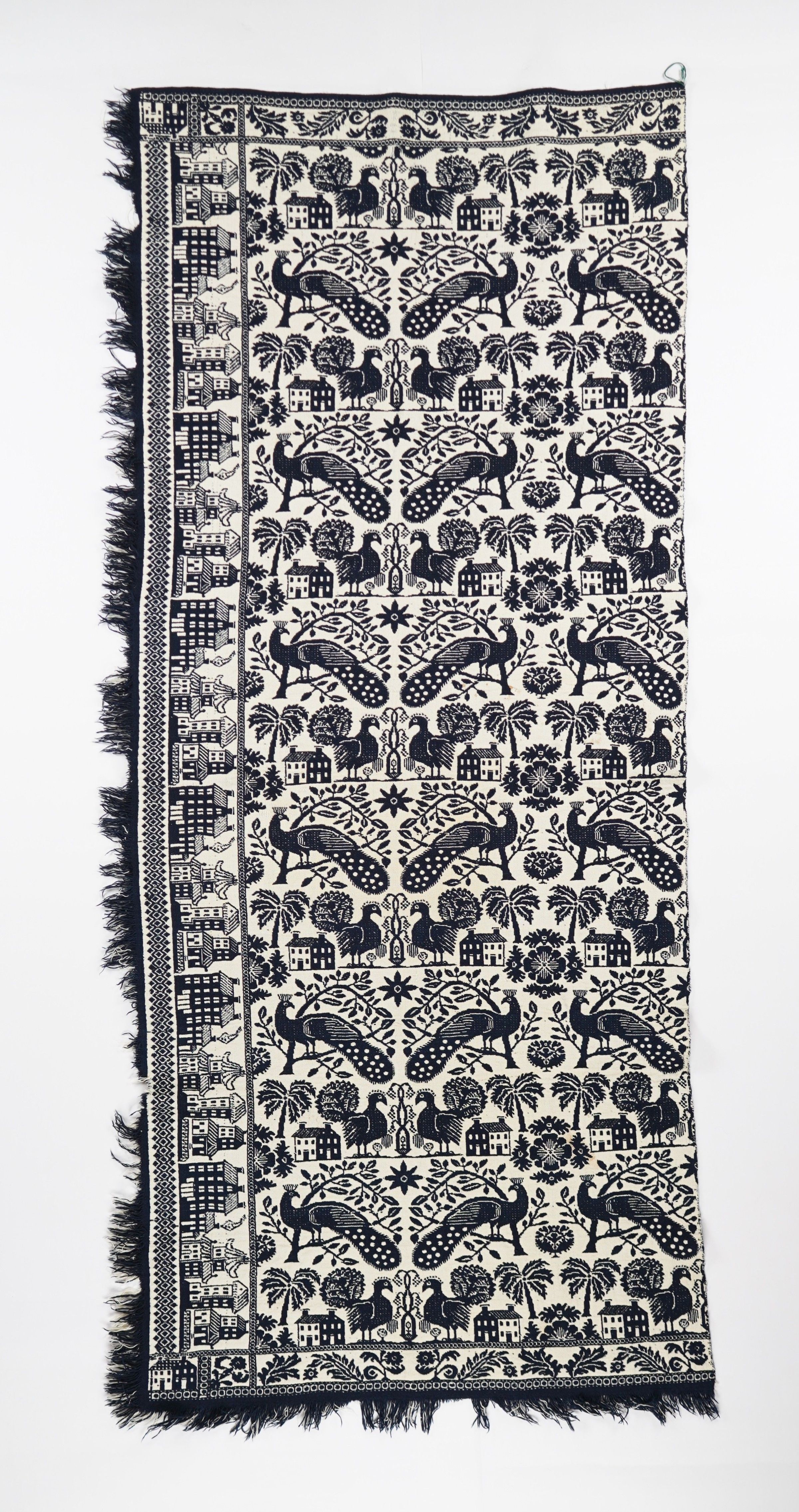 Figured and fancy doubleweave coverlet panel with wide side border, narrow top and bottom borders, and self-fringe on side and bottom. Single panel, seamless. Blue wool with undyed cotton. Peacock, turkey, palm tree, and house in the centerfield pattern; "East meets West" side border; leaves and flower stems in top and bottom borders.Context