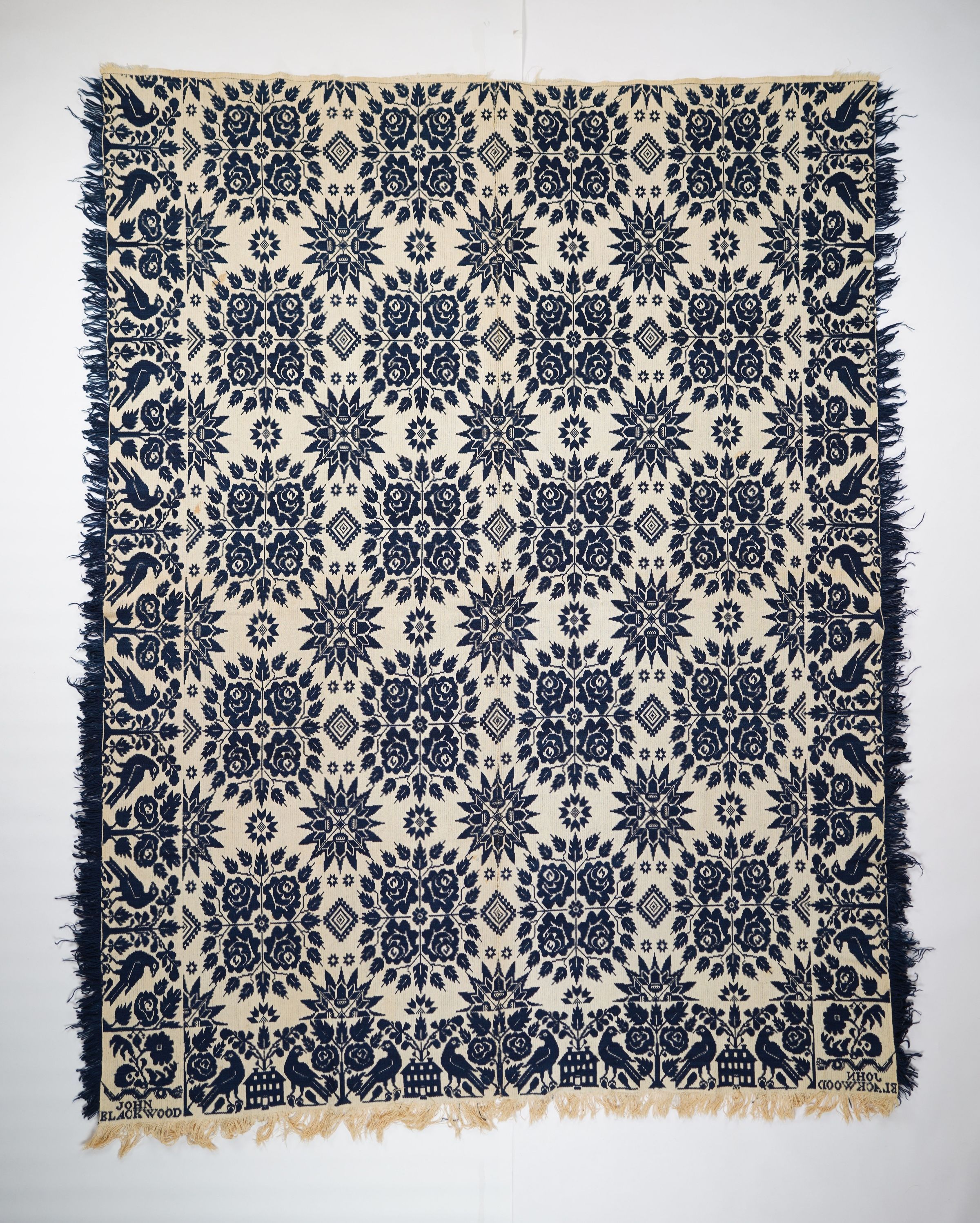 Navy and natural figured tied beiderwand coverlet with border and self-fringe on three sides. Two joined panels. "John Blackwood" in cornerblocks.Collection