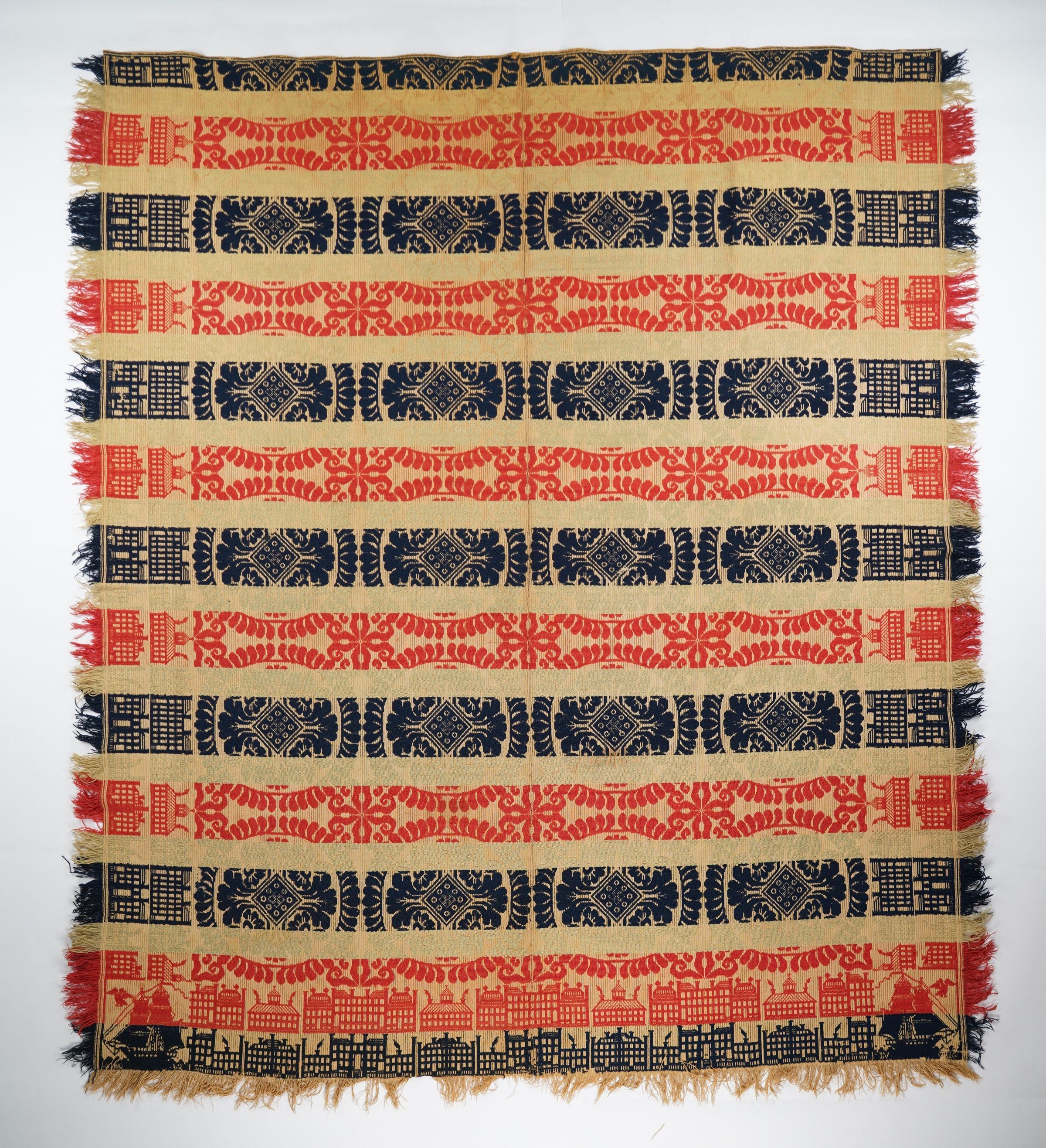 Green, red, navy, and natural figured tied beiderwand coverlet with border and self-fringe on three sides. Two joined panels. Woven in Ohio.Context