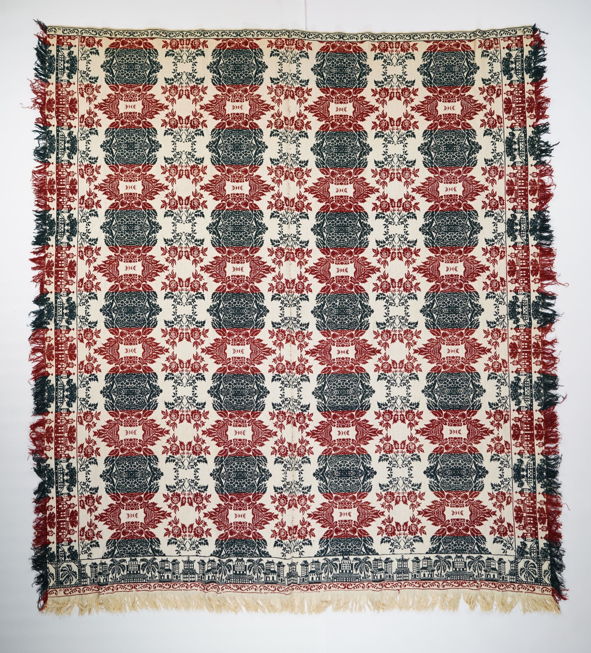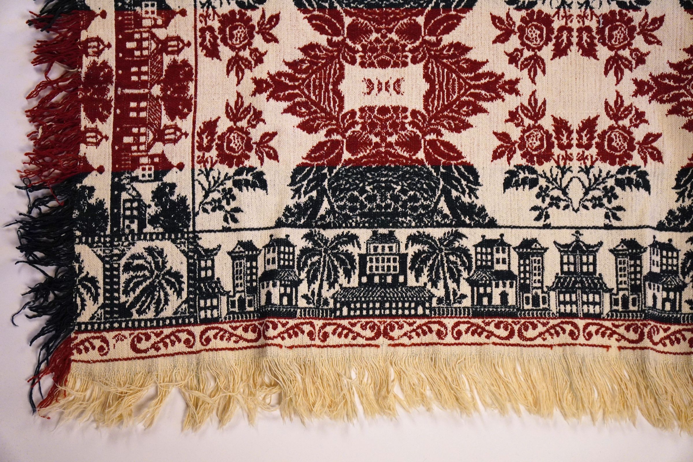 Navy, red, and natural figured tied beiderwand coverlet with border and self-fringe on four sides. Two joined panels. The cornerblocks feature a palm tree trademarkCollection