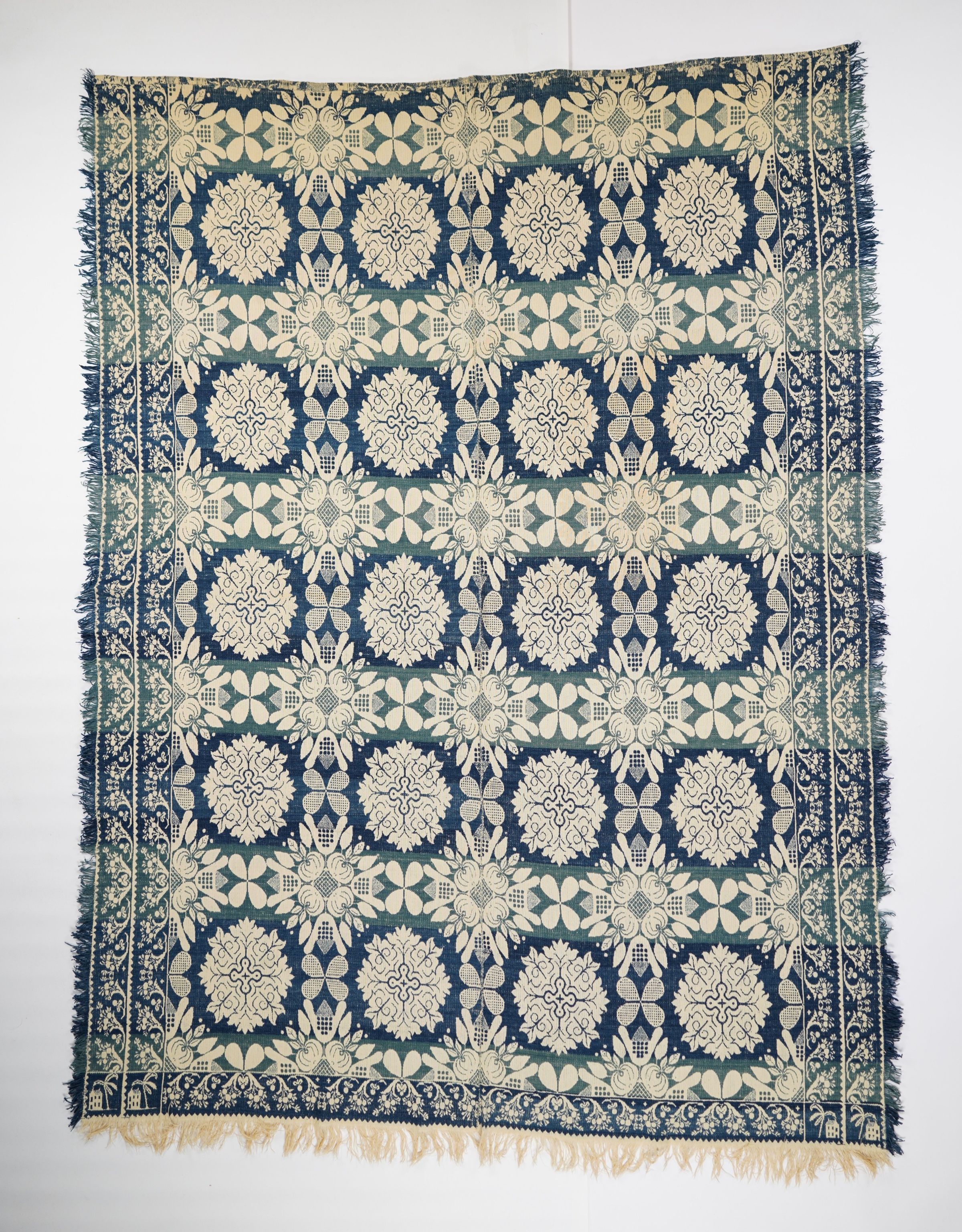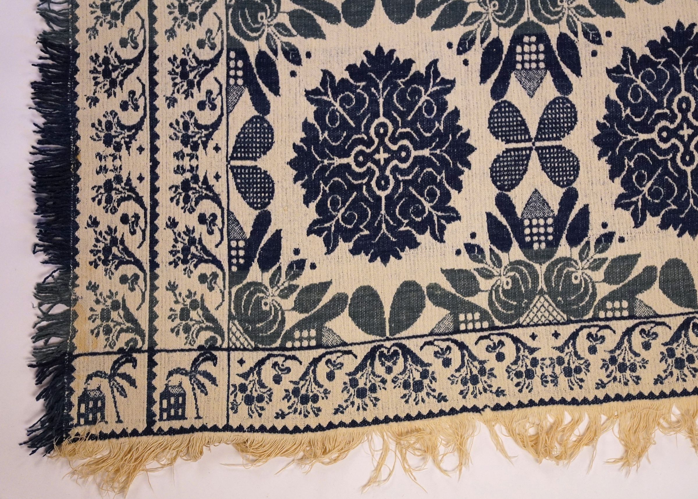 Navy, blue, and natural figured tied Beiderwand coverlet with bouquet border and self-fringe on three sides. Two joined panels. The cornerblocks feature a house with palm tree.Collection