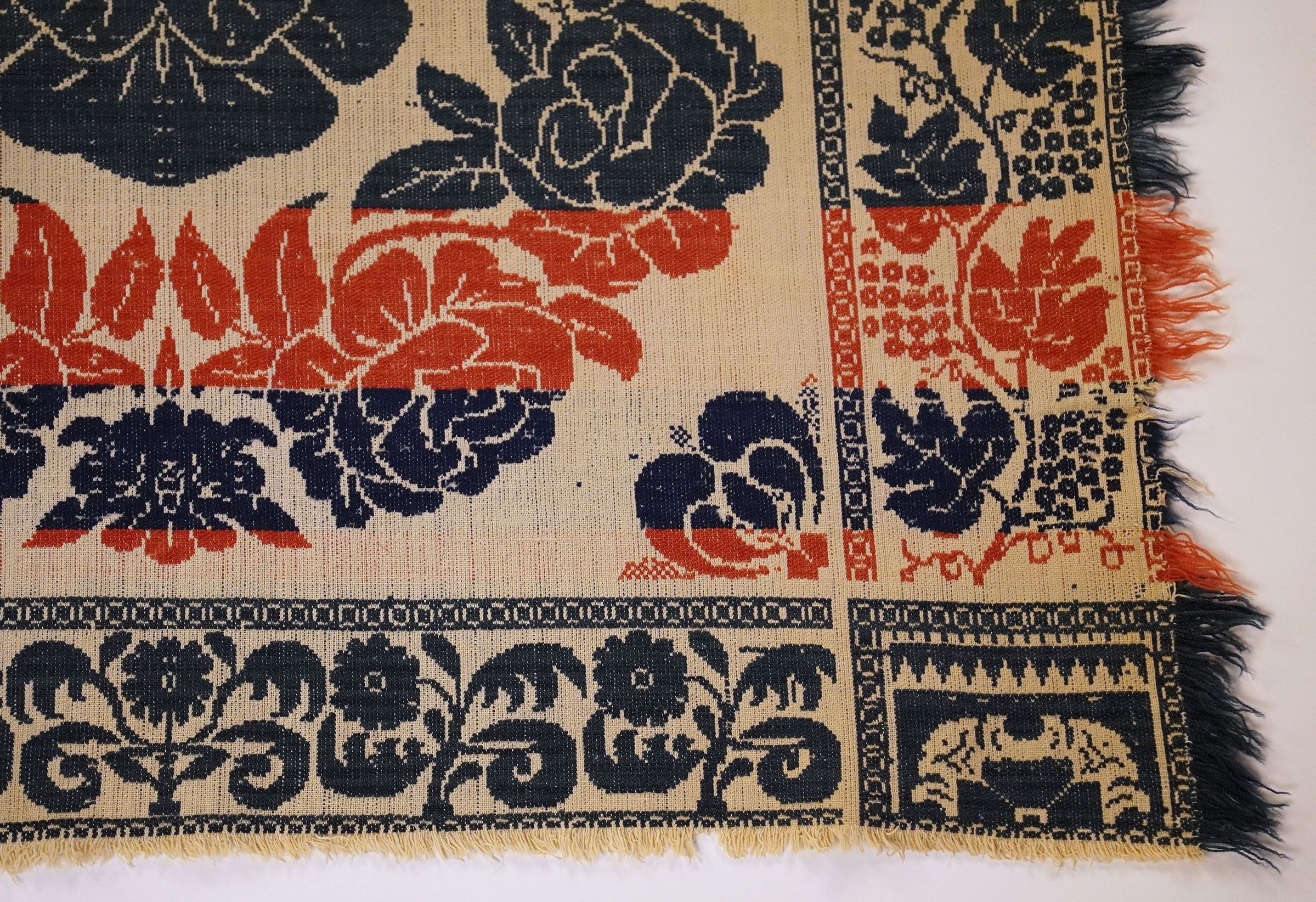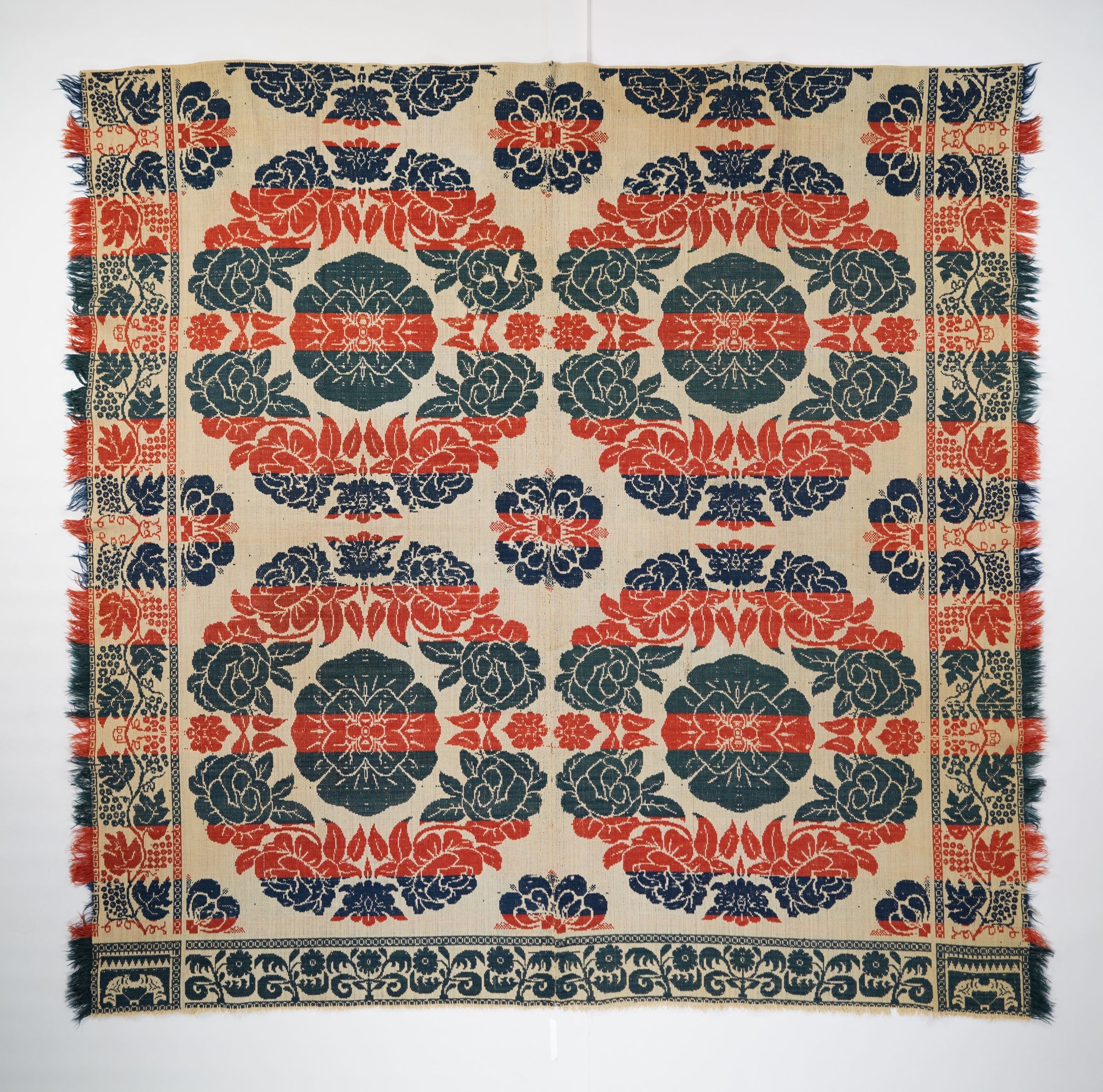 Blue/green, red, navy, and natural figured tied beiderwand coverlet with self-fringe on two sides and border on three sides. Two joined panels.Collection