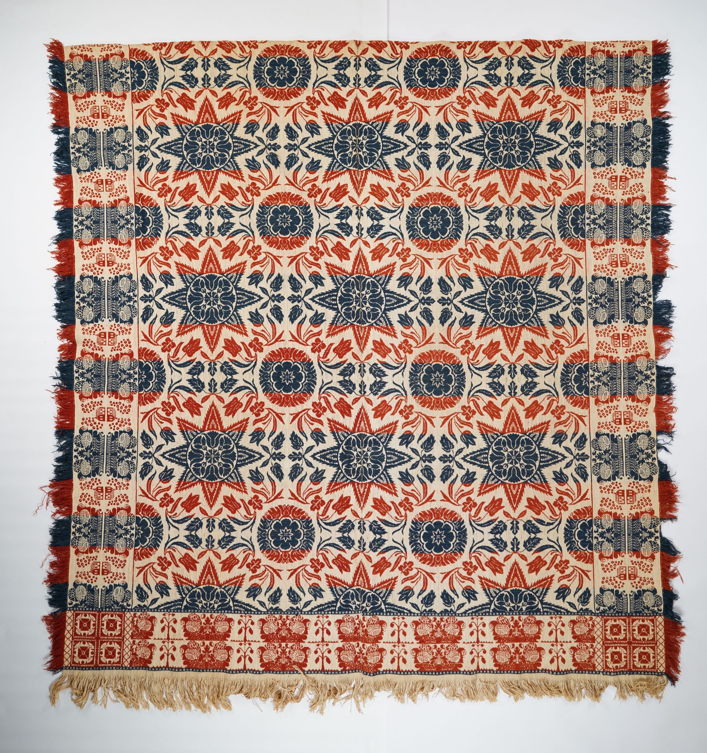Red, navy, and natural figured tied beiderwand coverlet with self-fringe and border on three sides.