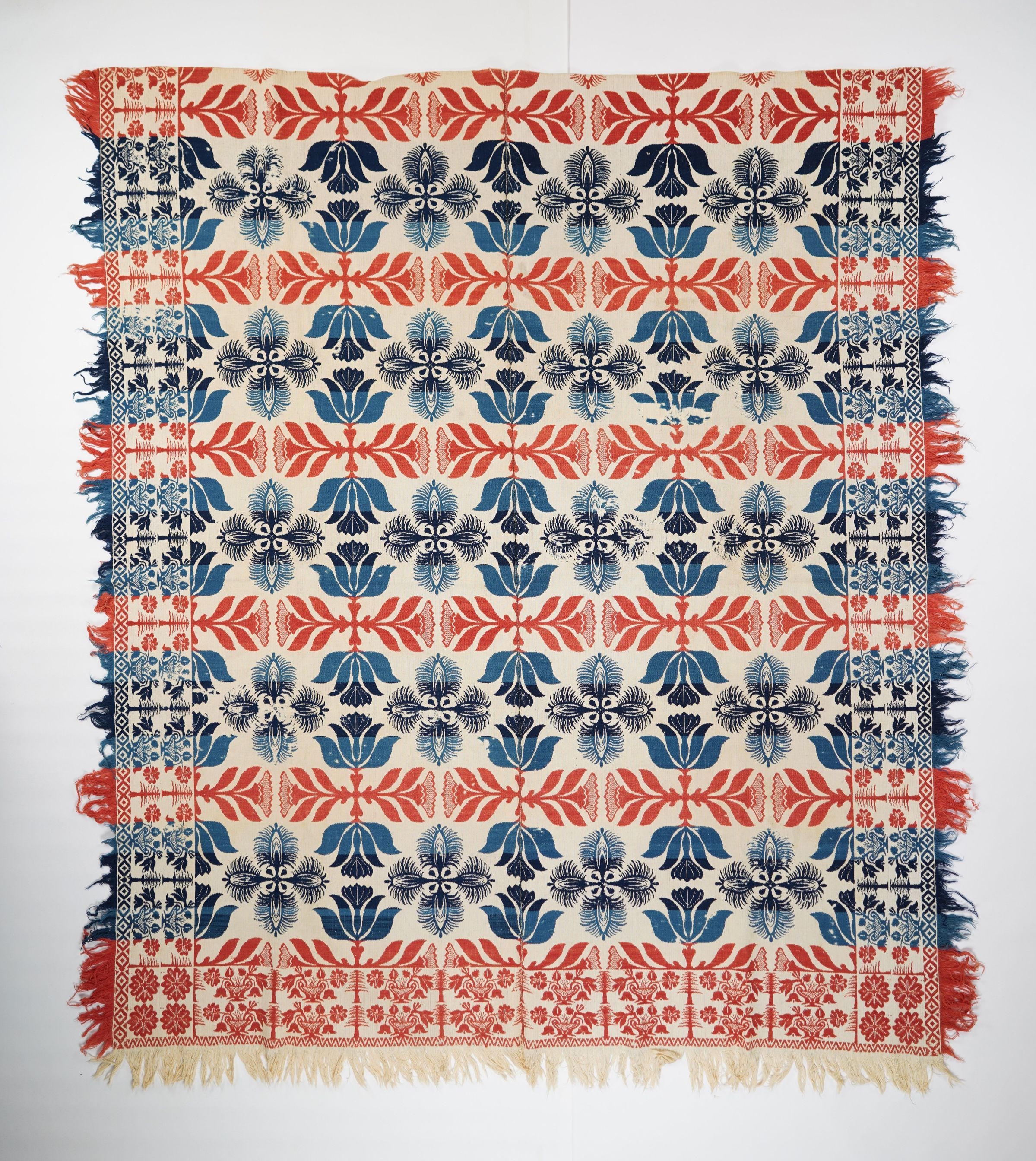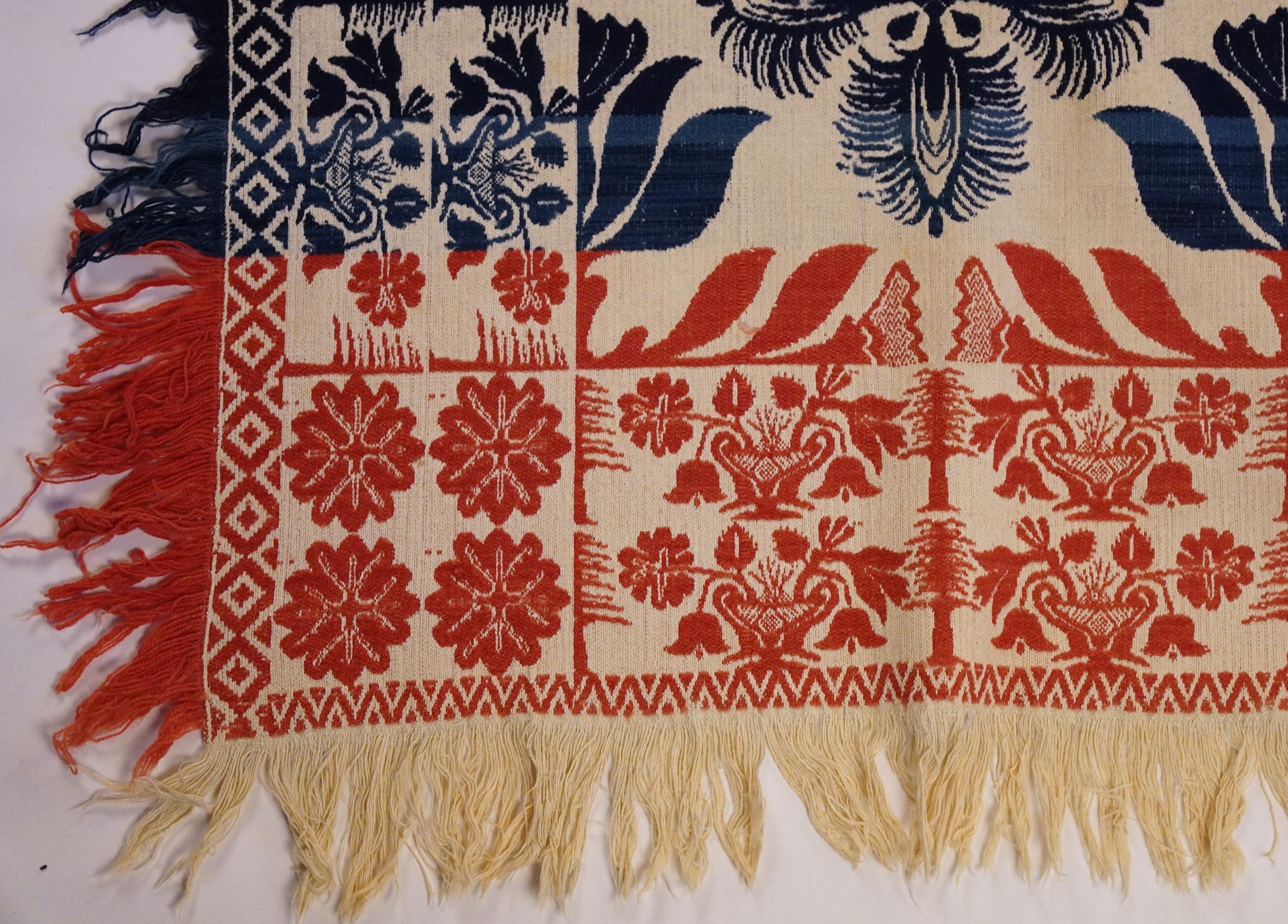 Red, blue, navy, and natural figured tied beiderwand coverlet with self-fringe and floral border on three sides. Two joined panels. Cornerblocks feature four flowers.Collection