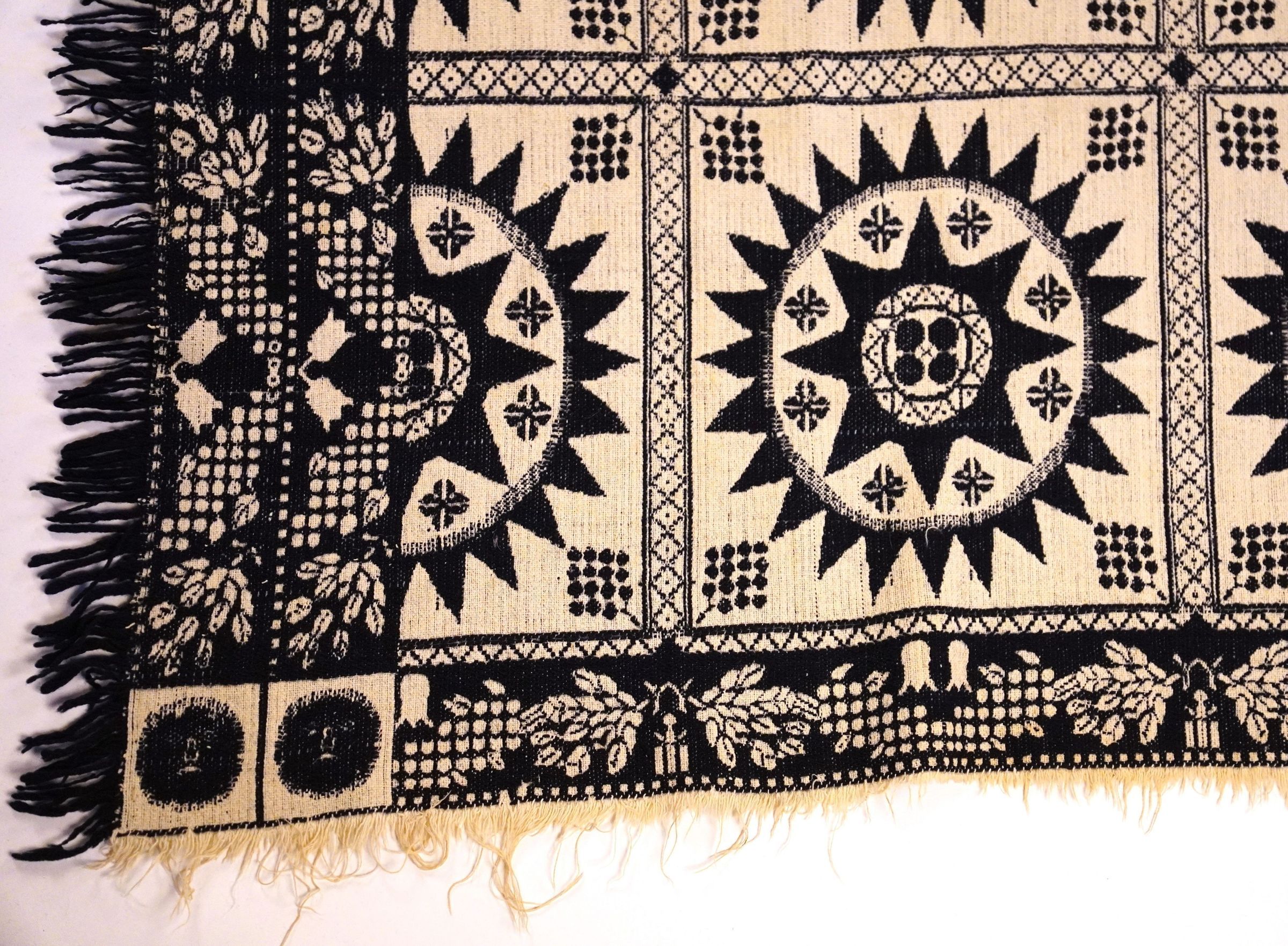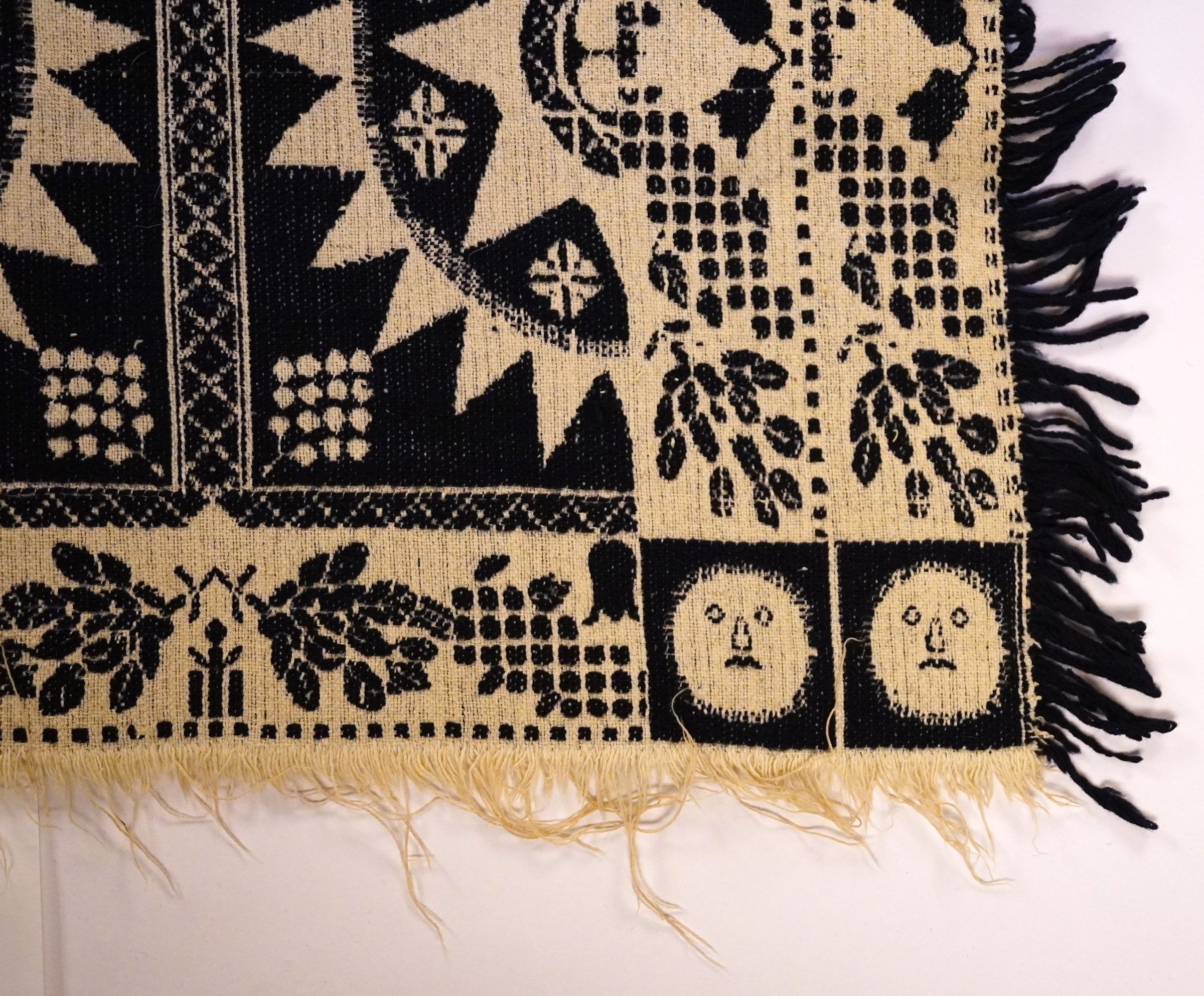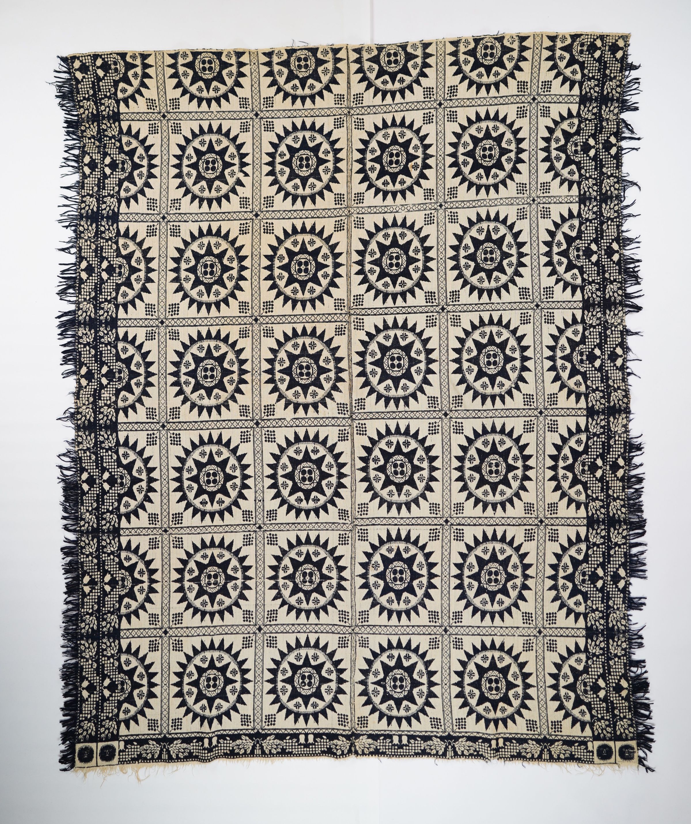 Navy and natural figured tied beiderwand coverlet with self-fringe and grapes border on three sides. Two joined panels. Double face cornerblock trademarks.Collection