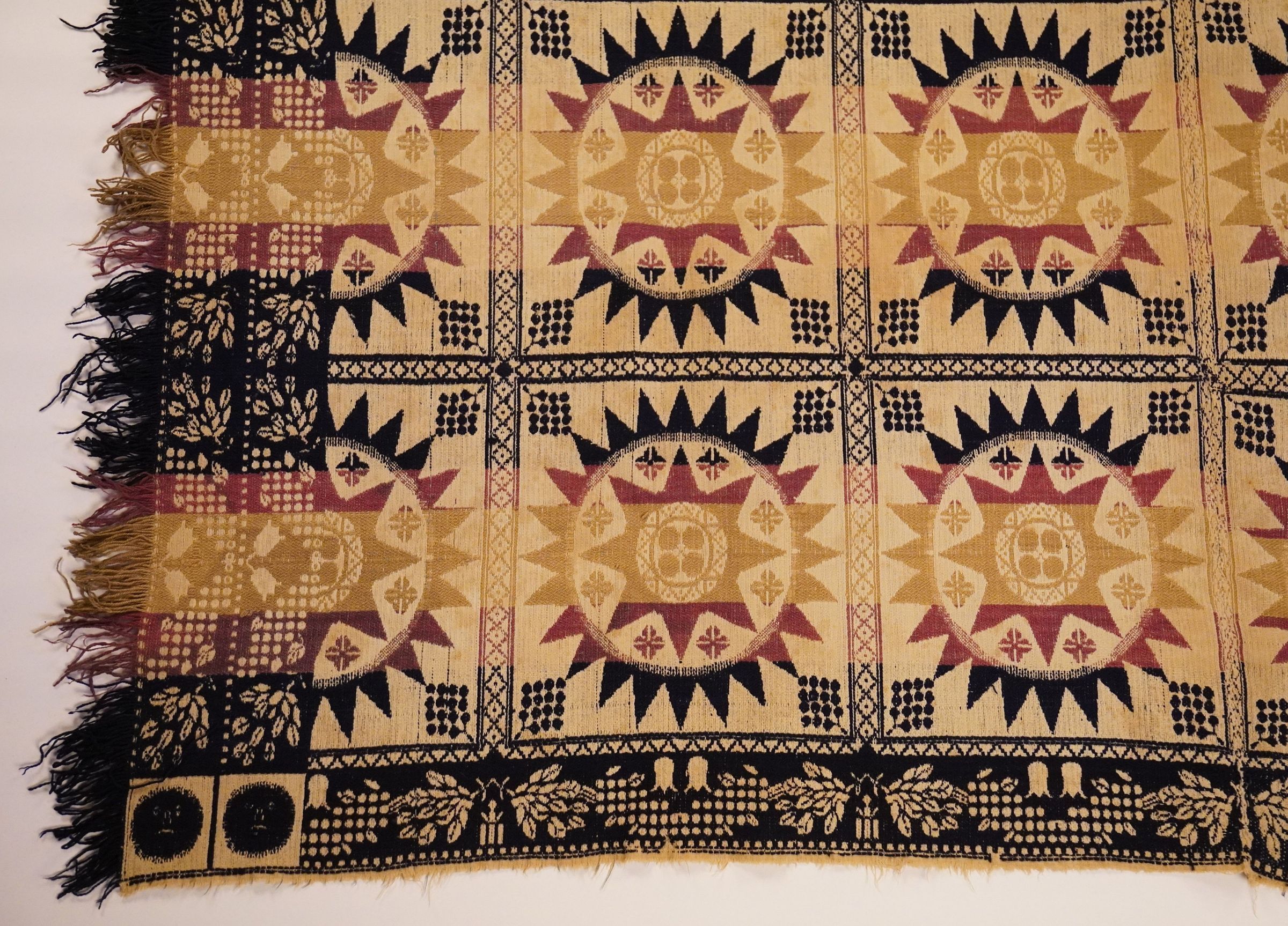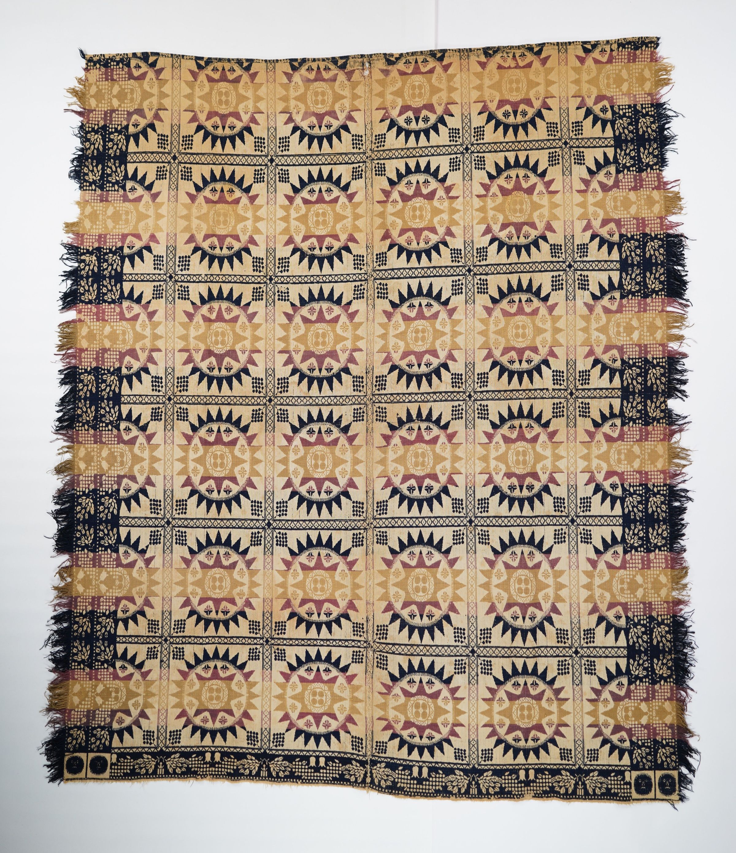 Navy, purple, yellow, and natural figured tied beiderwand coverlet with self-fringe on two sides. Grapes border on three sides. Double face cornerblock trademark.Collection