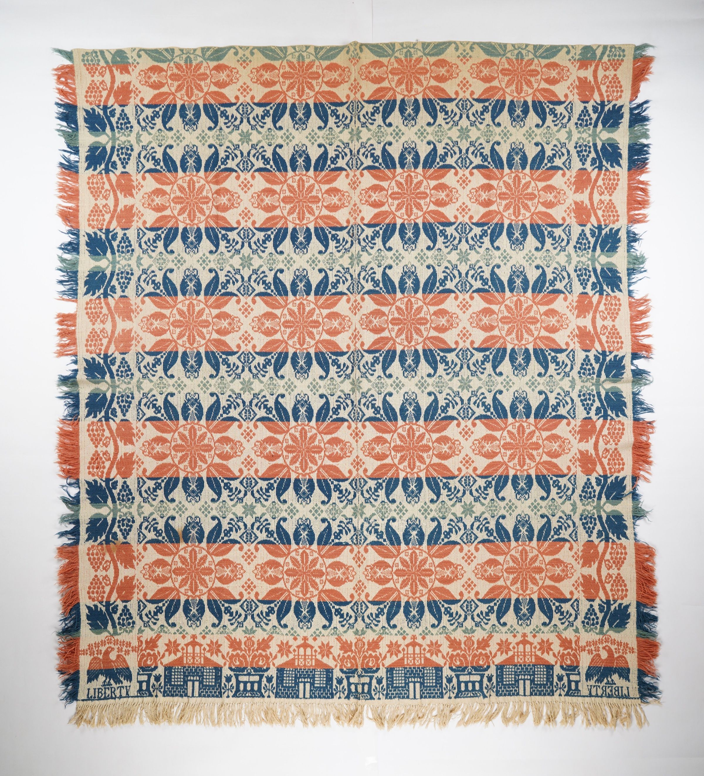 Figured and fancy doubleweave coverlet with borders on 3 sides and self-fringe on both sides and bottom. Two panels joined by a center seam. Navy, light blue, and red wool with undyed cotton. Floral medallions centerfield pattern; grapevine border on sides; Buildings and roses border on bottom. Liberty eagle trademark possibly attributed to F. Peter Bolinger.Context