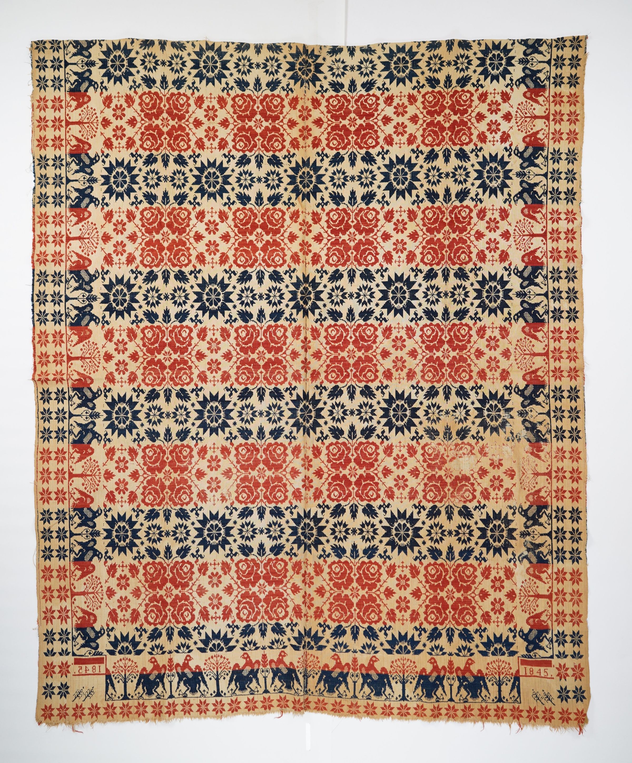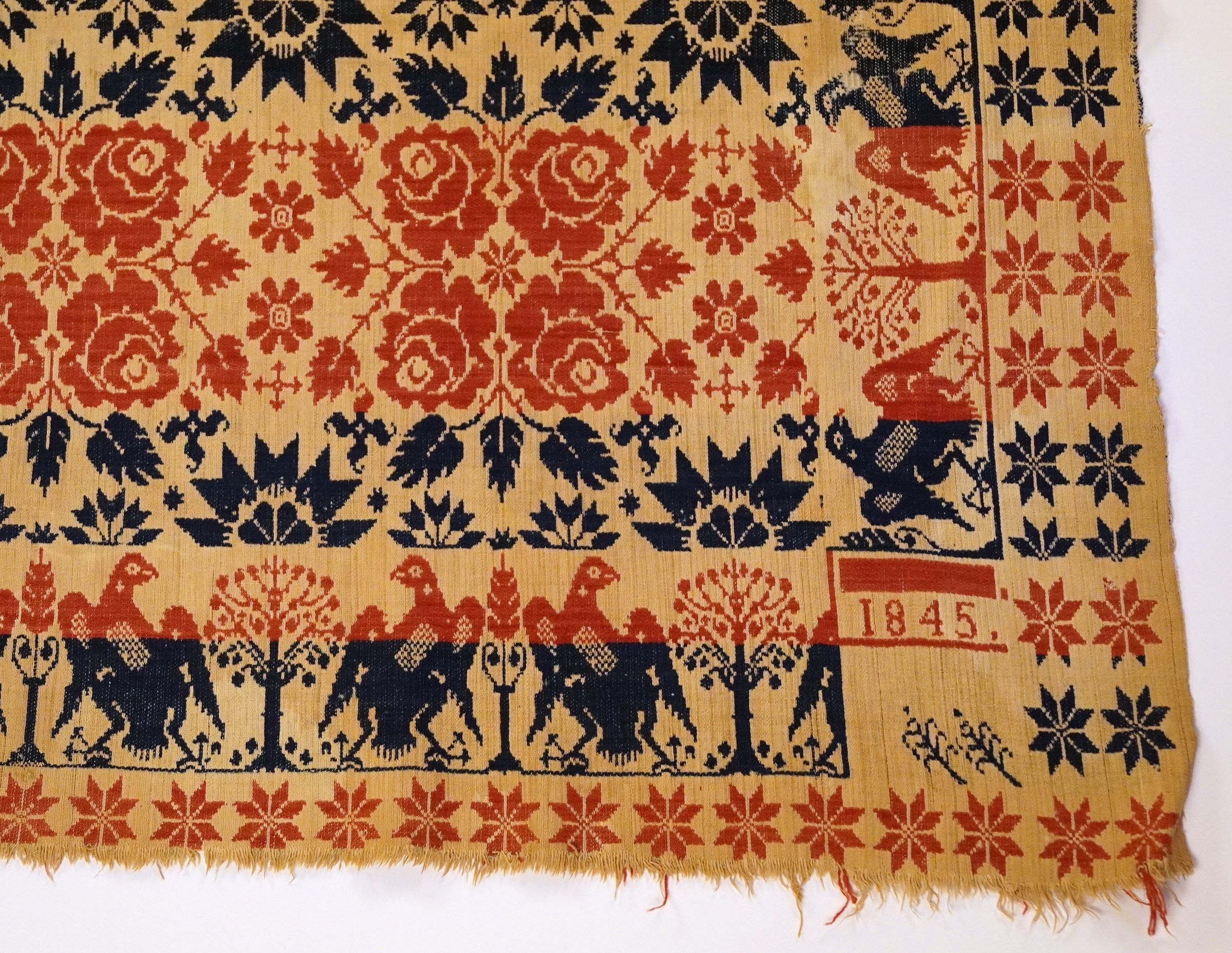 Navy, red, and natural figured tied beiderwand coverlet with eagle and tree border on three sides. Two joined panels. Woven in 1845.Collection