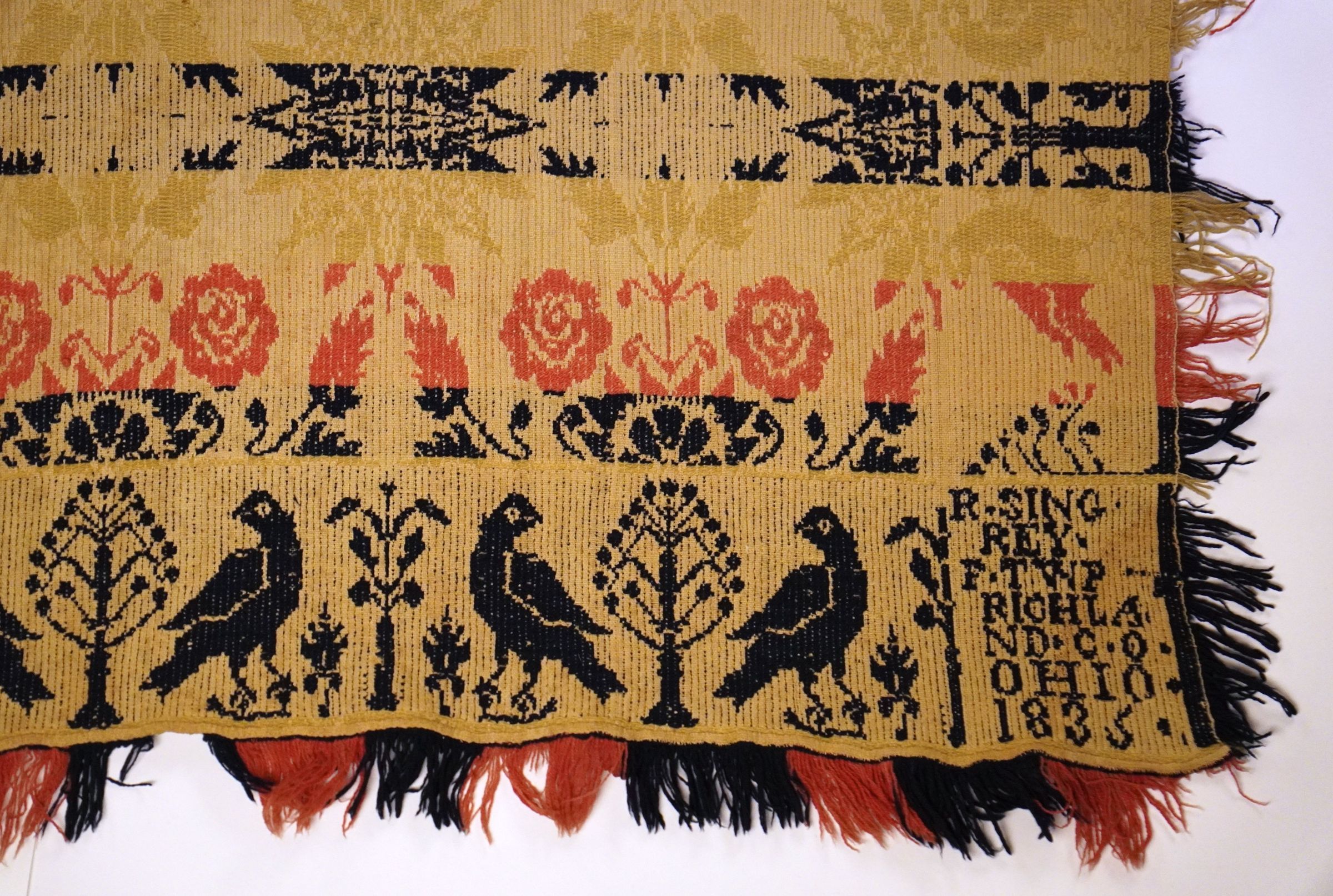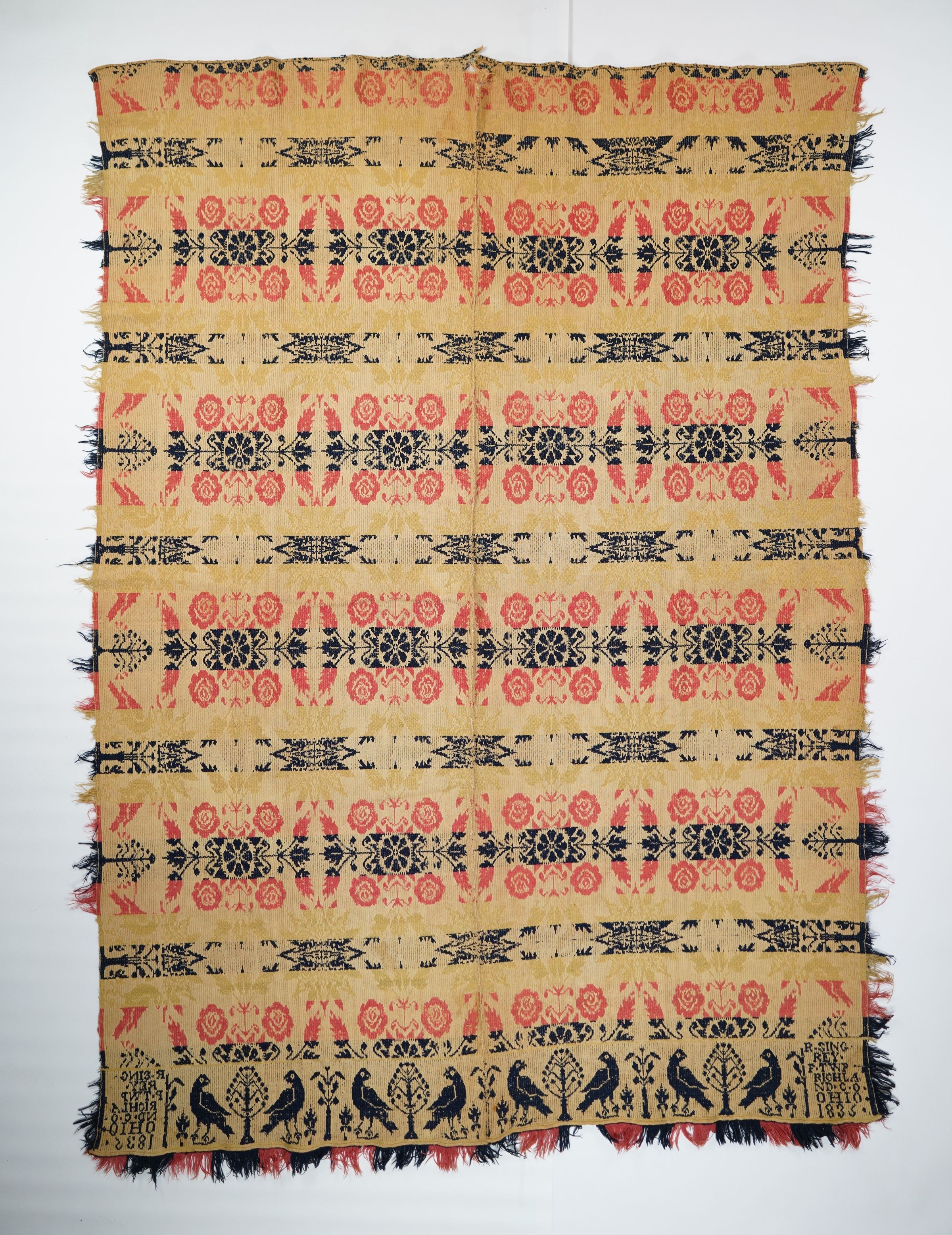 Red, yellow, navy, and natural figured tied beiderwand coverlet with self-fringe on left and right sides and applied fringe along bottom. Distelfink border on three sides. Two joined panels. Woven in (Perry Township?), Richland Co., Ohio in 1835 for R. Singrey.Collection