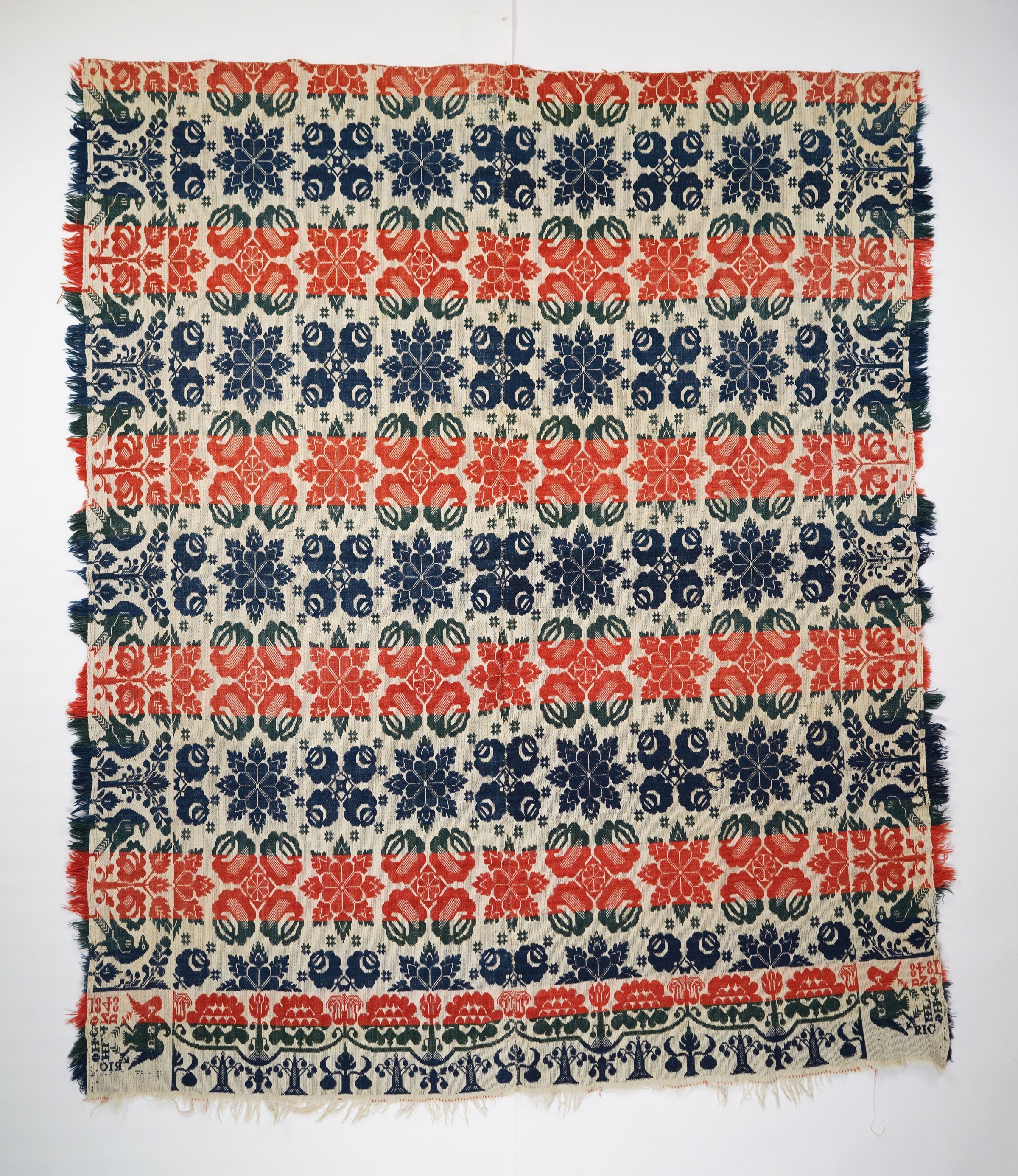 Red, navy, green, and natural tied beiderwand coverlet with border and self-fringe on three sides. Woven in Richland Co., Ohio in 1848.Collection