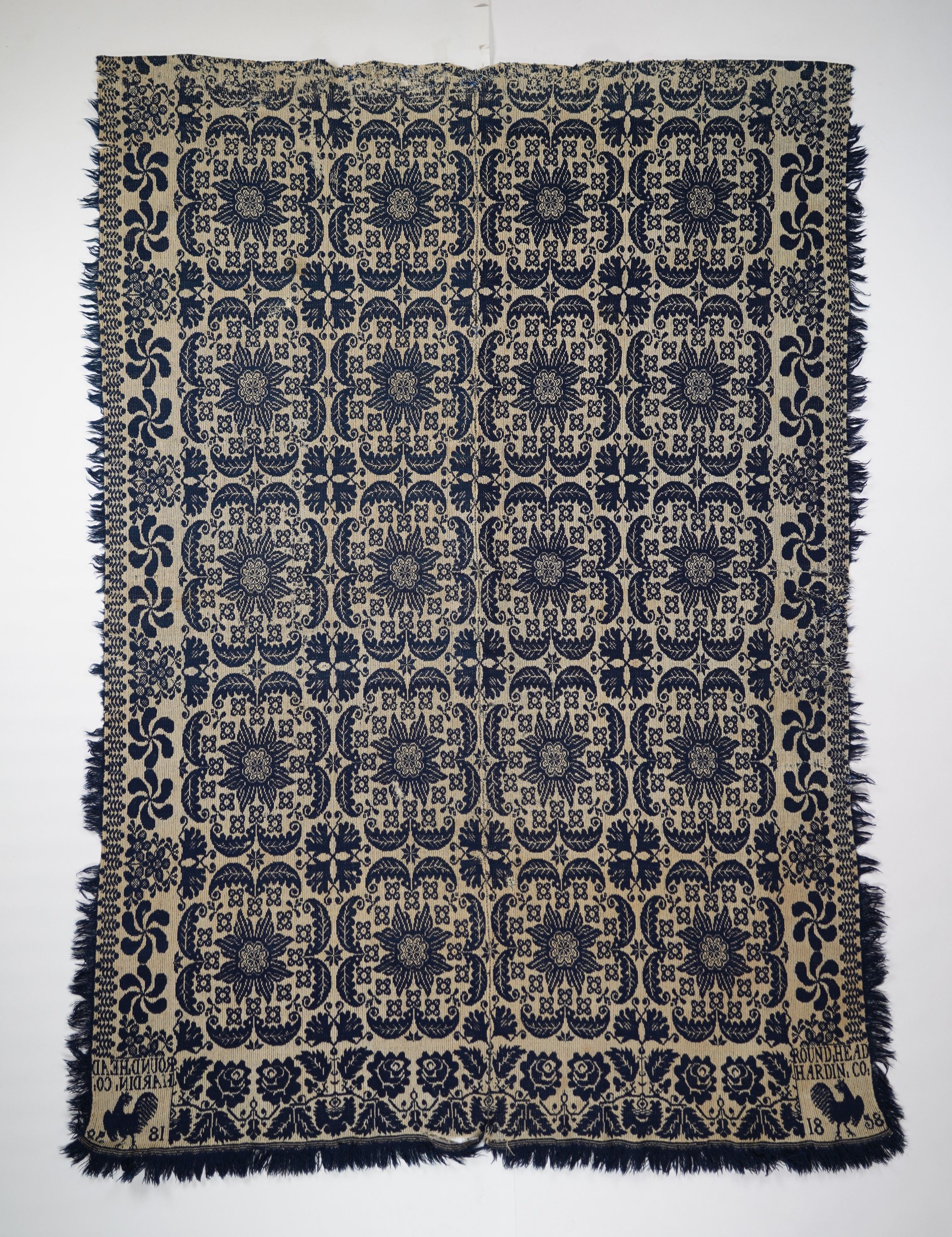 Navy and natural figured tied half doublecloth with border and applied fringe on three sides. Woven in Roundhead Twp., Hardin Co., Ohio in 1858,Collection