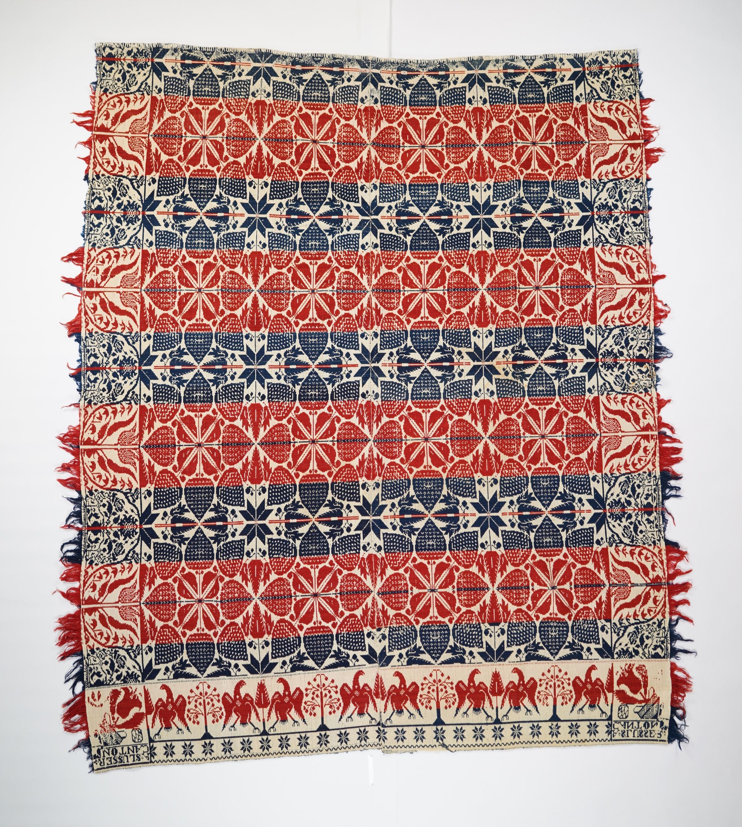 Red, navy, and natural figured tied beiderwand coverlet with border on three sides and self-fringe on left and right sides. Two joined panels. Woven for A. Slusser in Canton Twp., Stark Co., Ohio.Collection