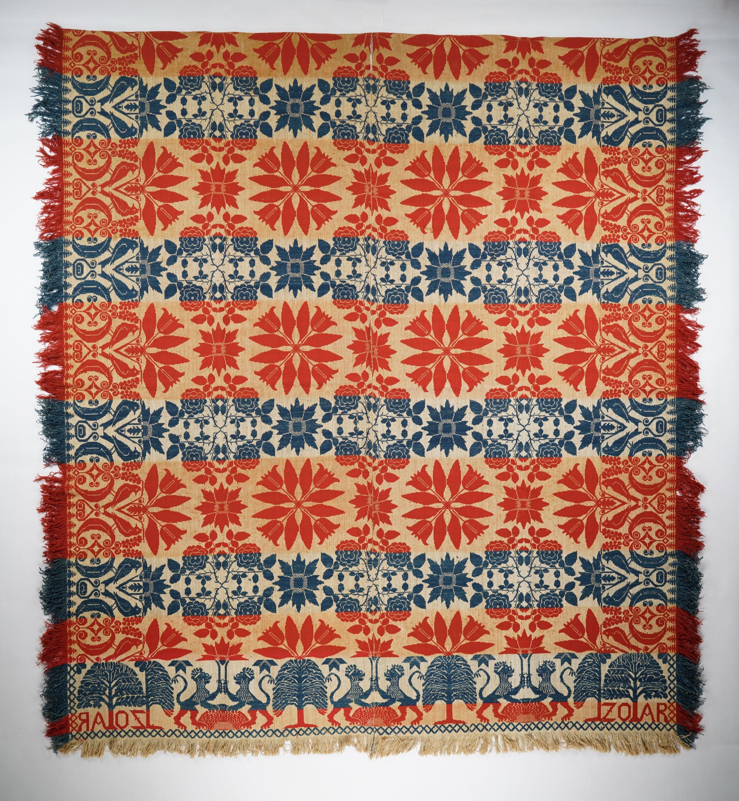 Figured and fancy tied beiderwand coverlet with borders on 3 sides and self-fringe on sides and bottom]. Two panels joined by a center seam.Navy and red wool with undyed cotton. Floral centerfield pattern; bird border on sides; lion border on bottom. Unknown weaver with "Zoar" trademark.Context