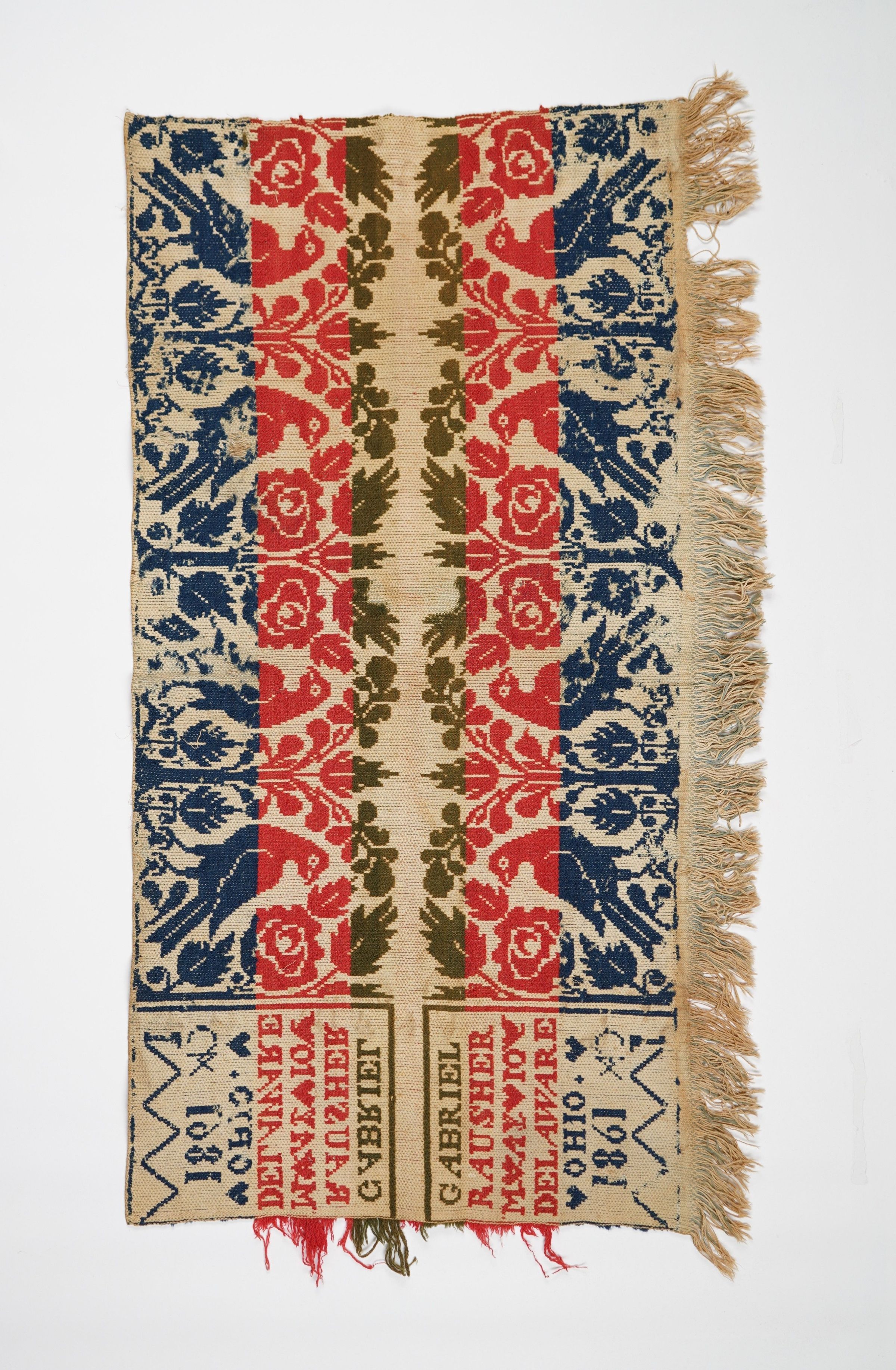 Red, green, blue, navy, and natural figured tied half doublecloth crib coverlet with self-fringe on right side. Woven by Gabriel Rausher in Delaware, Delaware Co., Ohio in 1861.Collection