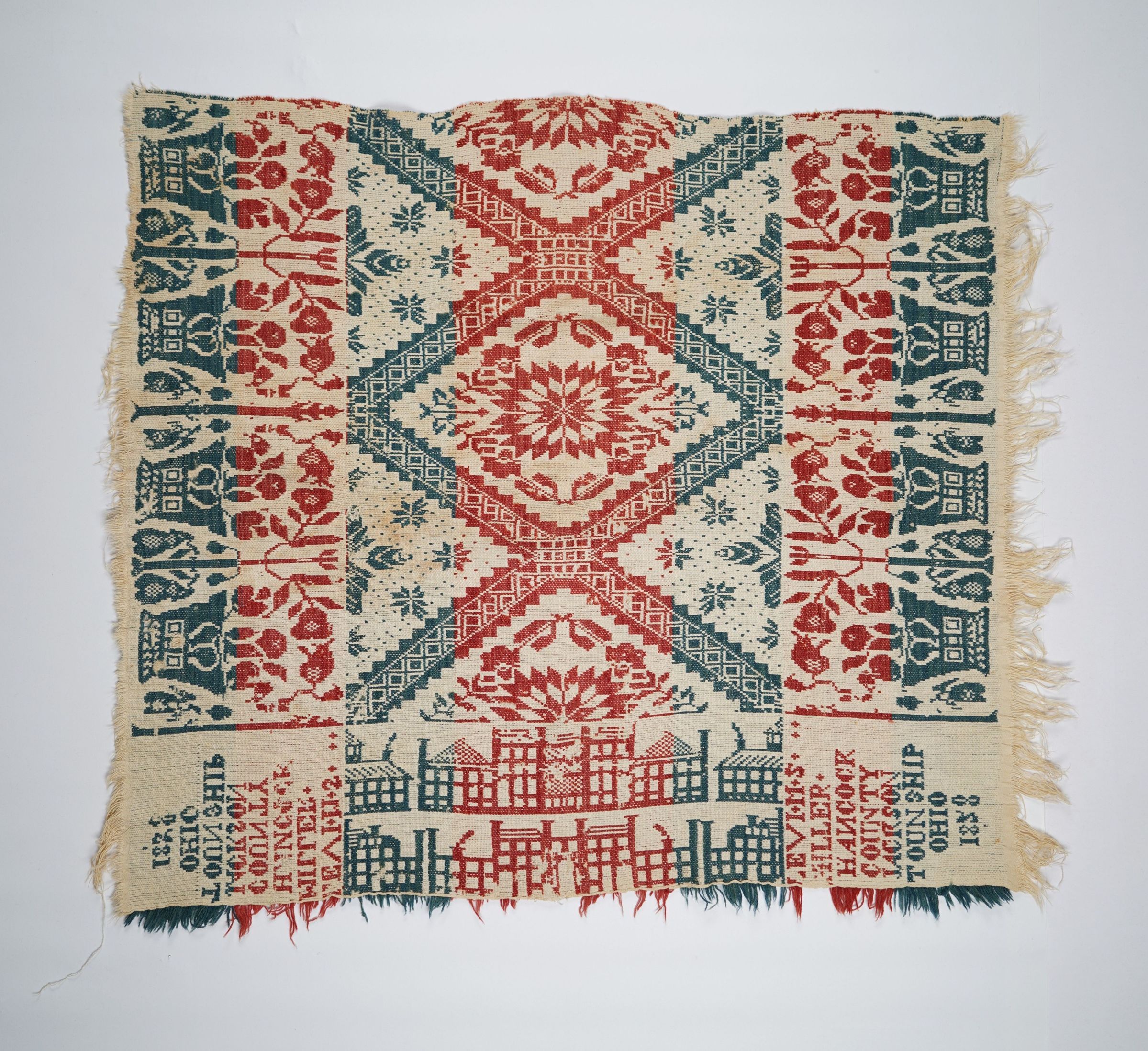 Blue, red, and natural figured tied half doublecloth crib coverlet with border and self-fringe on three sides. Woven by Levi M. S. Miller in Jackson Twp., Hancock Co., Ohio in 1858.Collection