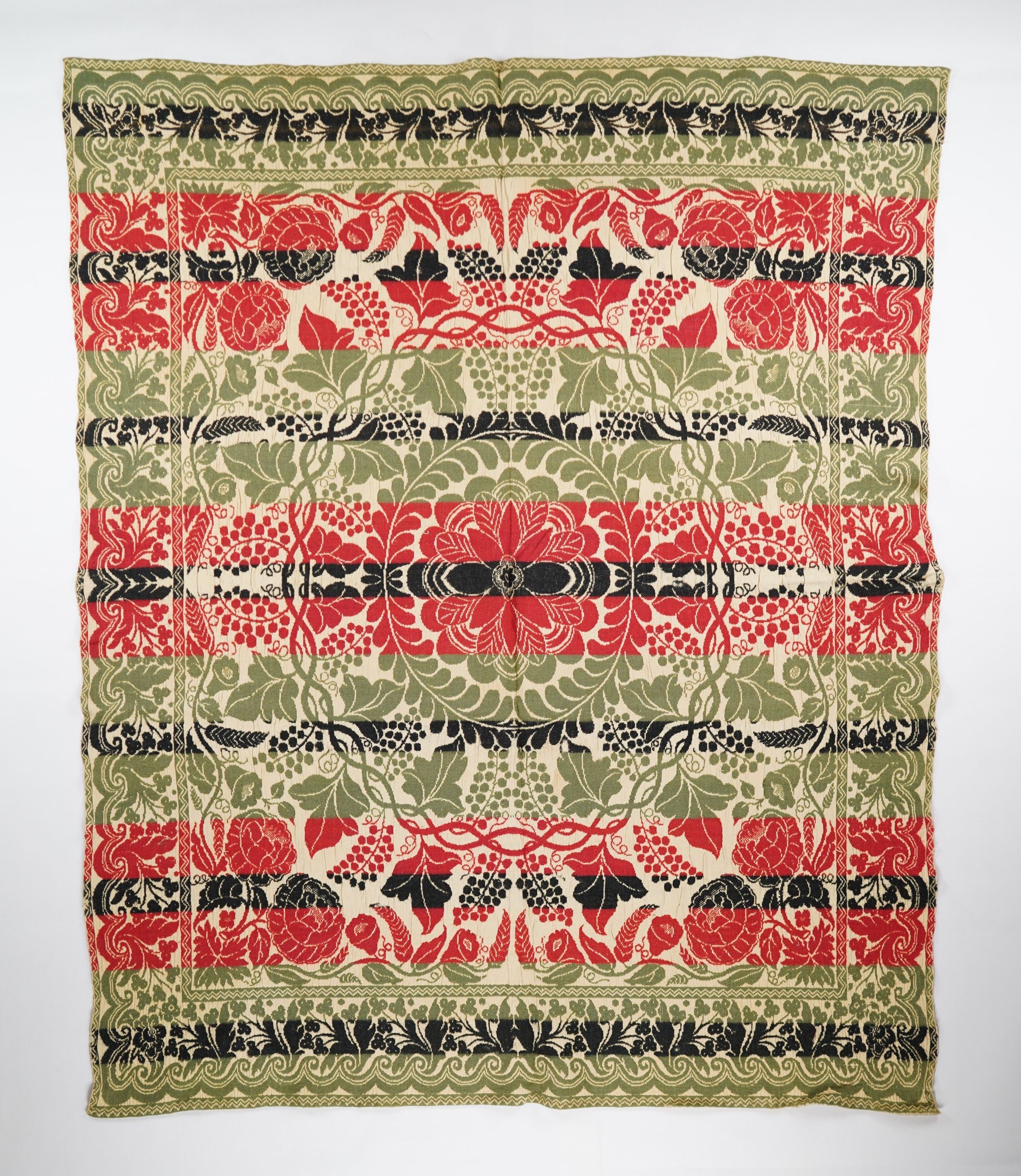 Figured and fancy coverlet with no fringe. Two panels joined by a center seam. Blue/black, green, and red wool with undyed cotton. Grapevine center medallion pattern with floral border on all sides.Context