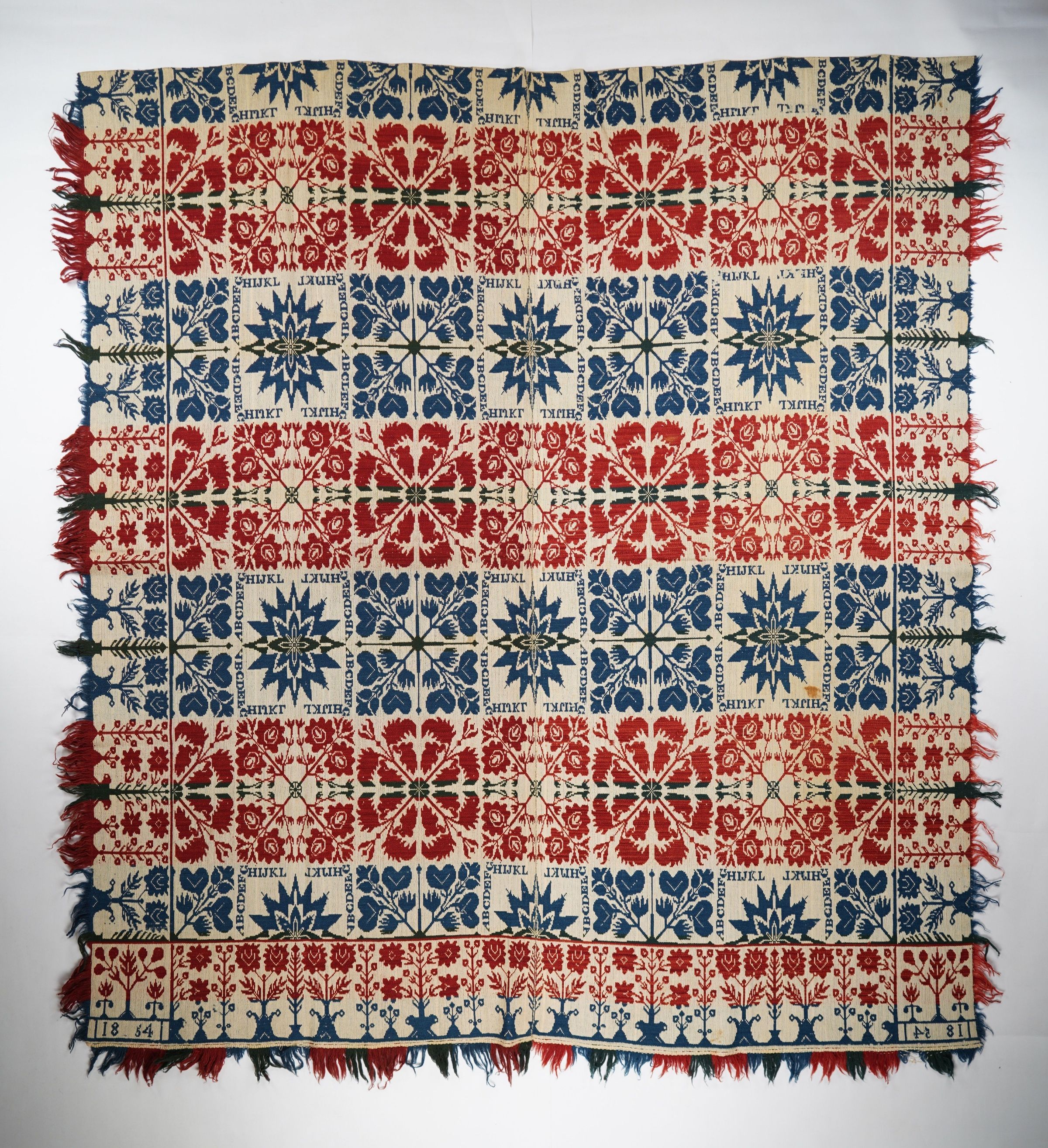 Figured and fancy tied beiderwand coverlet with borders on 3 sides and self-fringe on sides and applied fringe on bottom. Two panels joined by a center seam. Blue, red, and green wool with undyed cotton. Starburst centerfield pattern; floral border on sides and bottom. Woven in 1854.Context