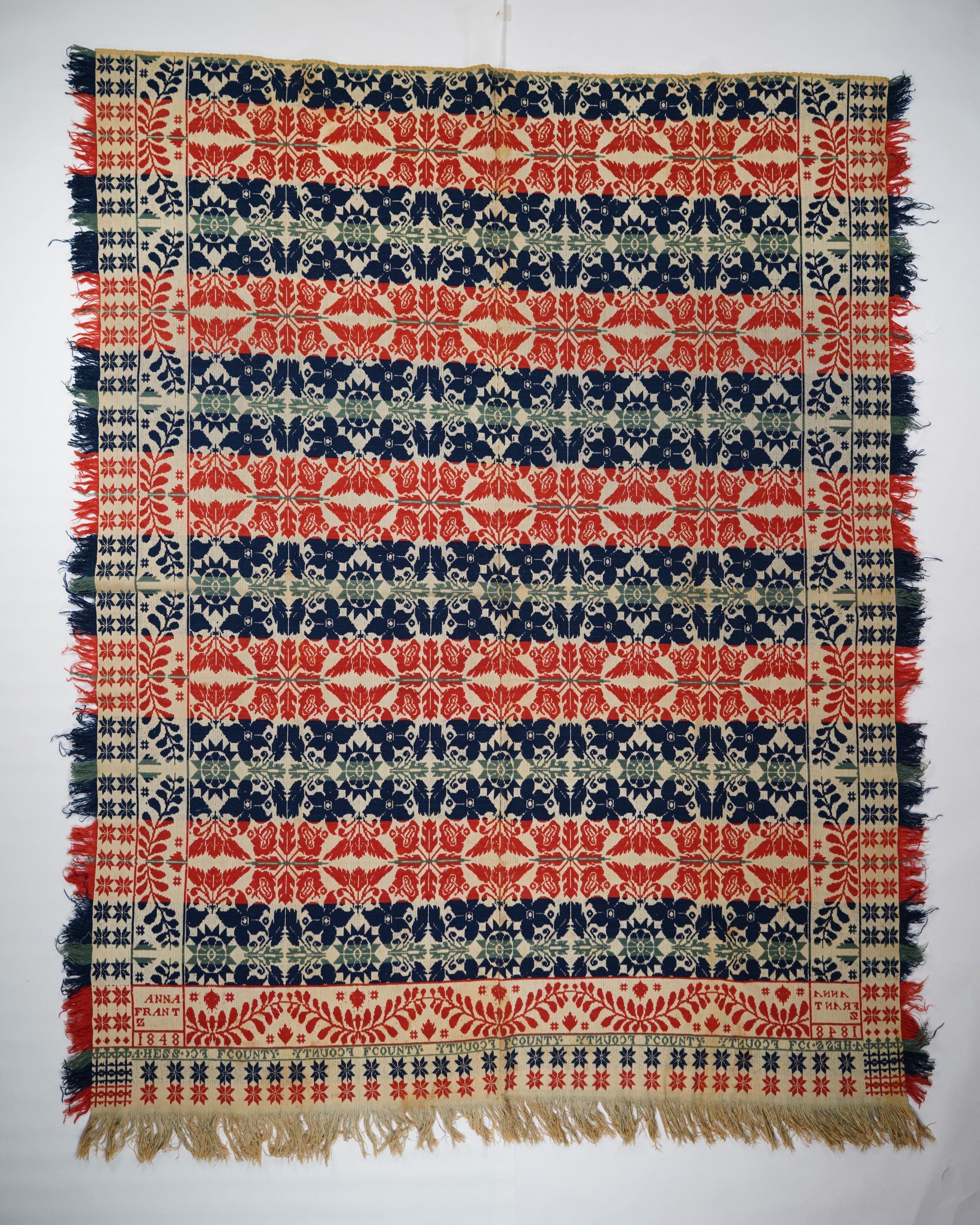 Red, green, navy, blue, and natural figured tied half doublecloth coverlet with border and self-fringe on three sides. Two joined panels. Woven for Anna Frantz by A. Hess in Franklin County in 1848.Collection