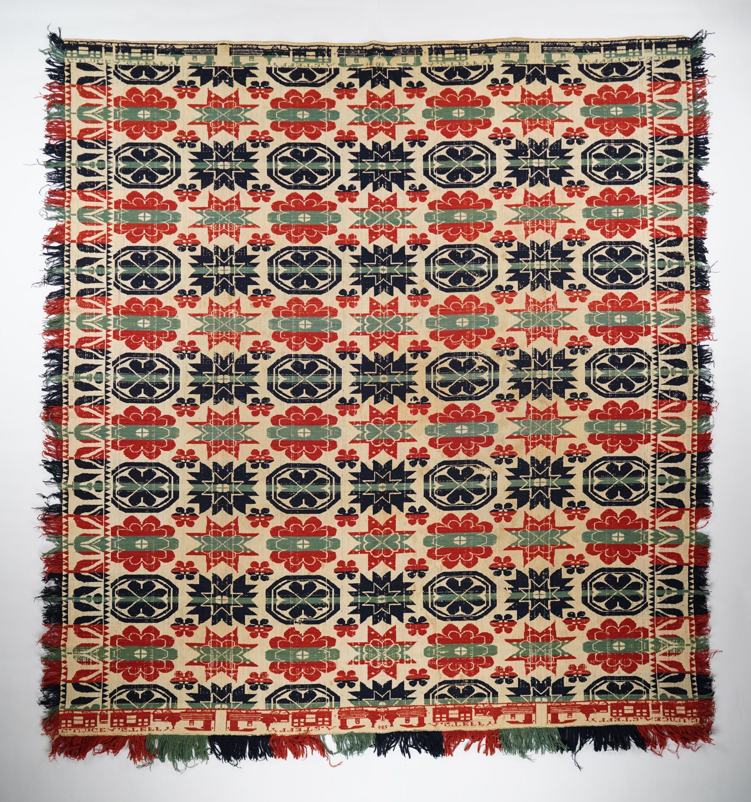 Figured and fancy tied beiderwnd coverlet with borders on 4 sides and self-fringe on sides and applied fringe on bottom. Woven full-width; seamless. Navy, red, and green wool with undyed cotton. Floral and star centerfield pattern; tulip border on sides; train border on bottom and top. Woven by A. Steffy for C. Unce.Context