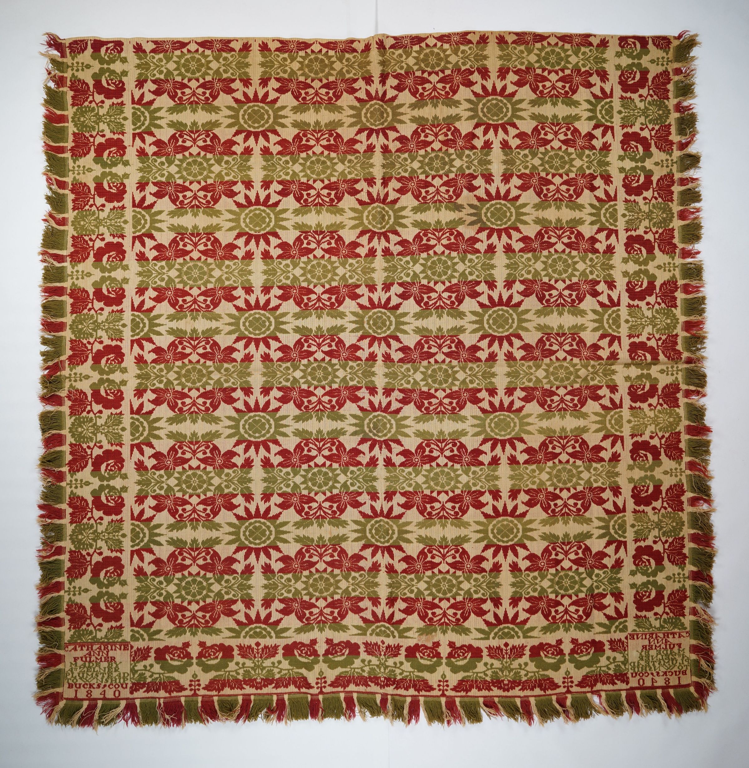 Red, green, and natural figured tied half doublecloth coverlet with border and applied fringe on three sides. Two joined panels. Woven for Catharine Ann Fulmer (1829-1896) by Aaron Zelner in Plumstead Twp., Bucks Co., Pennsylvania in 1840.Collection