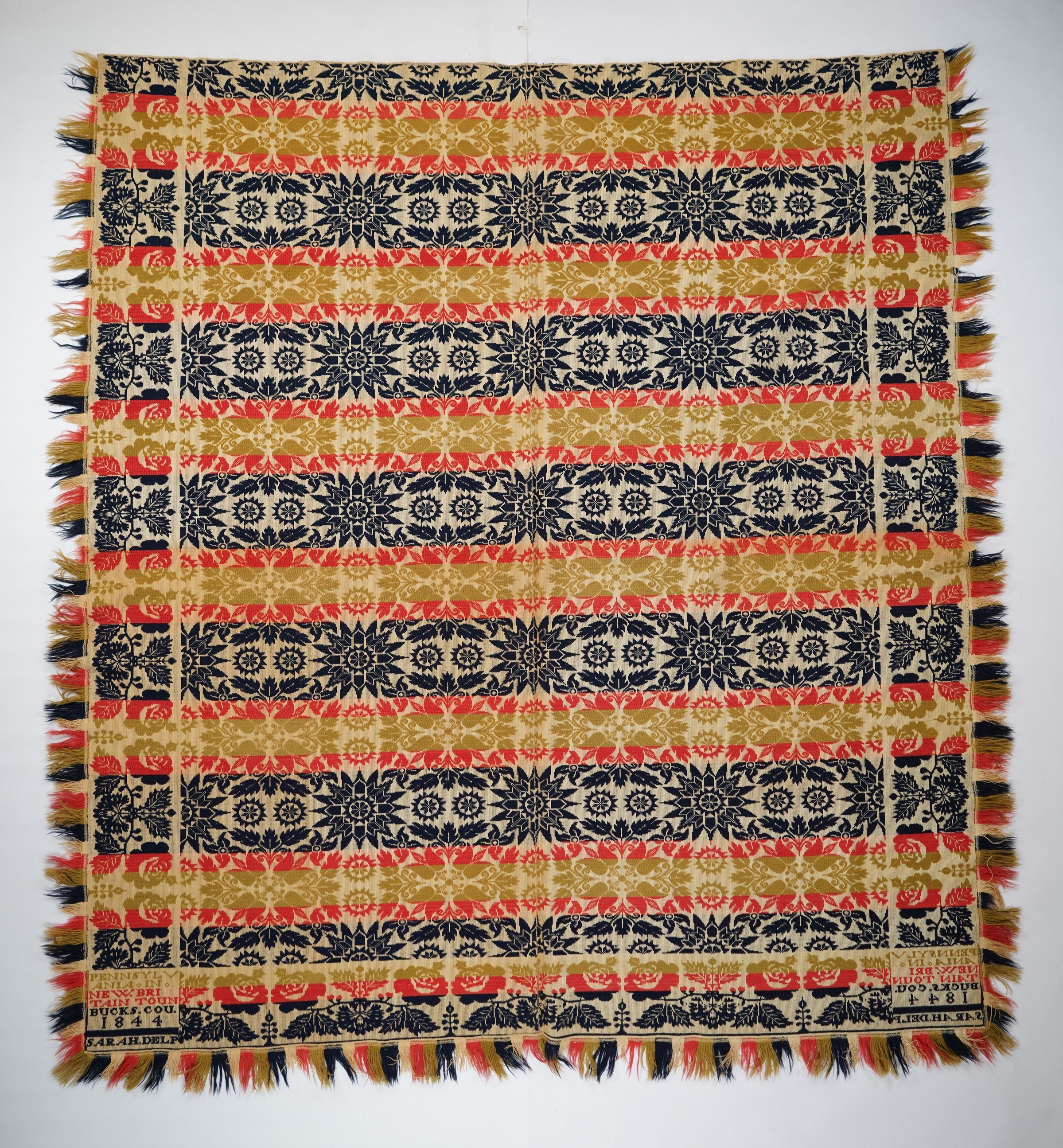 Red, yellow, navy, and natural figured tied half doublecloth coverlet with border and applied fringe on three sides. Woven for Sarah Delp by Abraham Lapp (attr.) in New Britain Twp., Bucks Co., Pennsylvania in 1844.Collection