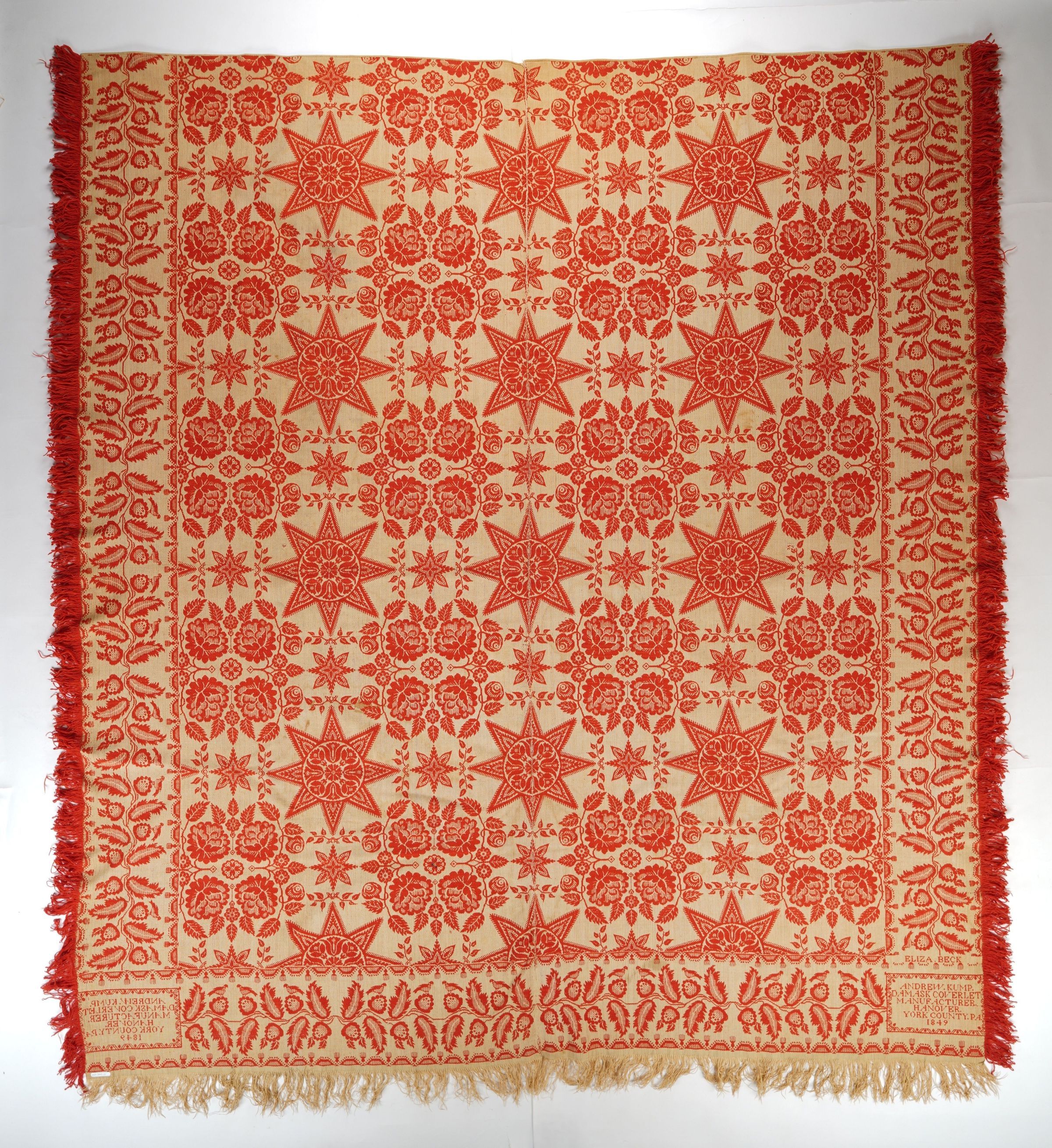 ELIZA. BECK / ANDREW. KUMP. / DAMASK COVERLET / MANUFACTURER. / HANOVER. / YORK COUNTY. PA. / 1849Material/Technique
