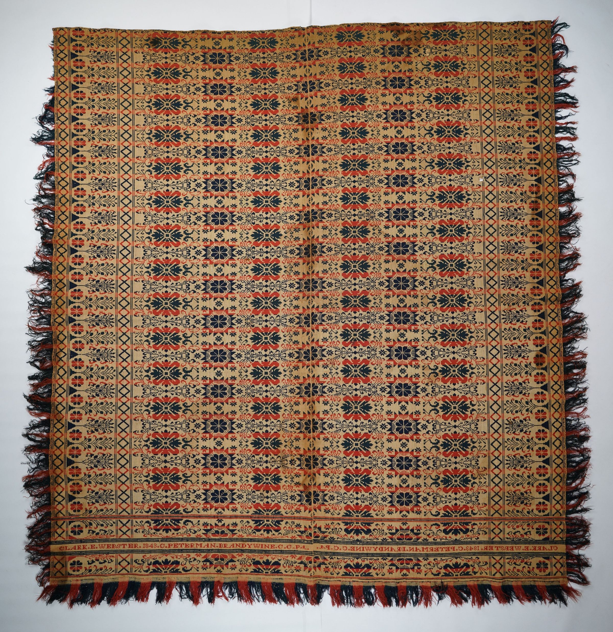 Red, navy, and natural figured tied half doublecloth with border and fringe on three sides. Woven for Clark E. Webster by Casper Peterman in East Brandywine Twp., Chester Co., Pennsylvania in 1843.Collection