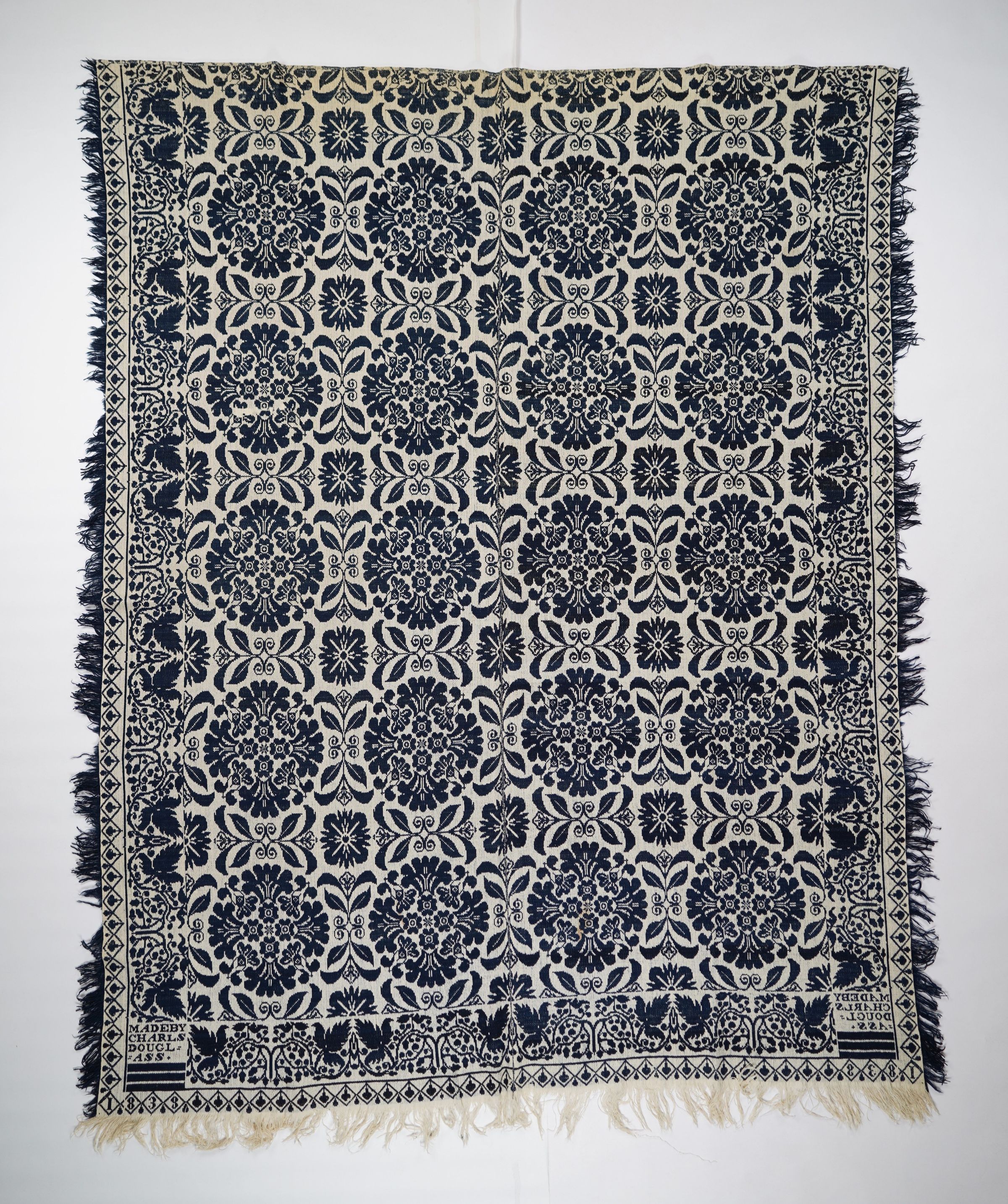 Navy and natural figured tied half doublecloth coverlet with border and self-fringe on three sides. Two joined panels. Woven by Charles Douglass in Brownsville, Fayette Co., Pennsylvania in 1833.Collection