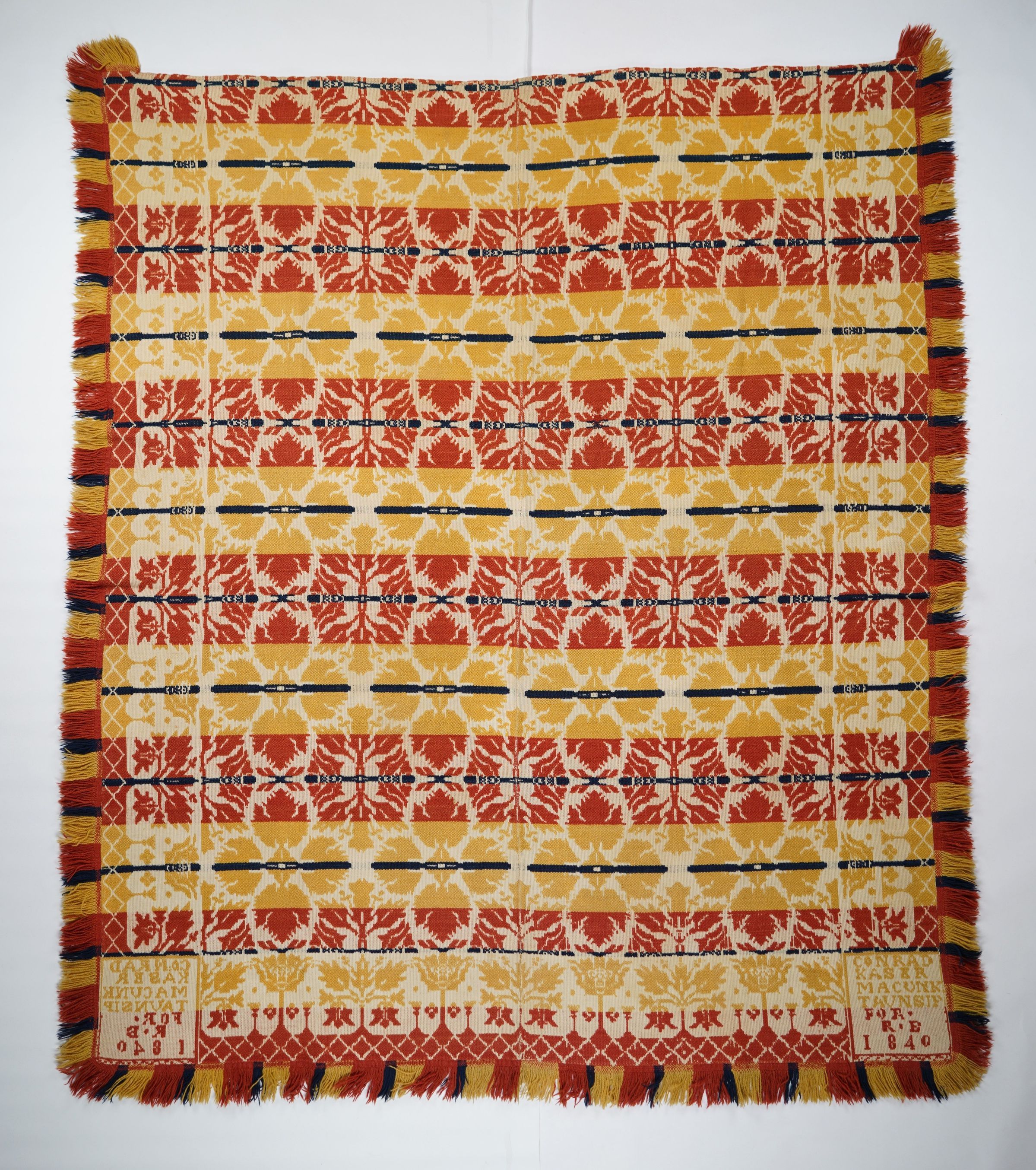 Yellow, red, navy, and natural figured tied half doublecloth coverlet with border and applied fringe on three sides. Two joined panels. Woven for R. B. by Conrad Kaiser in Upper or Lower Macungie Twp., Lehigh Co., Pennsylvania in 1846.Collection