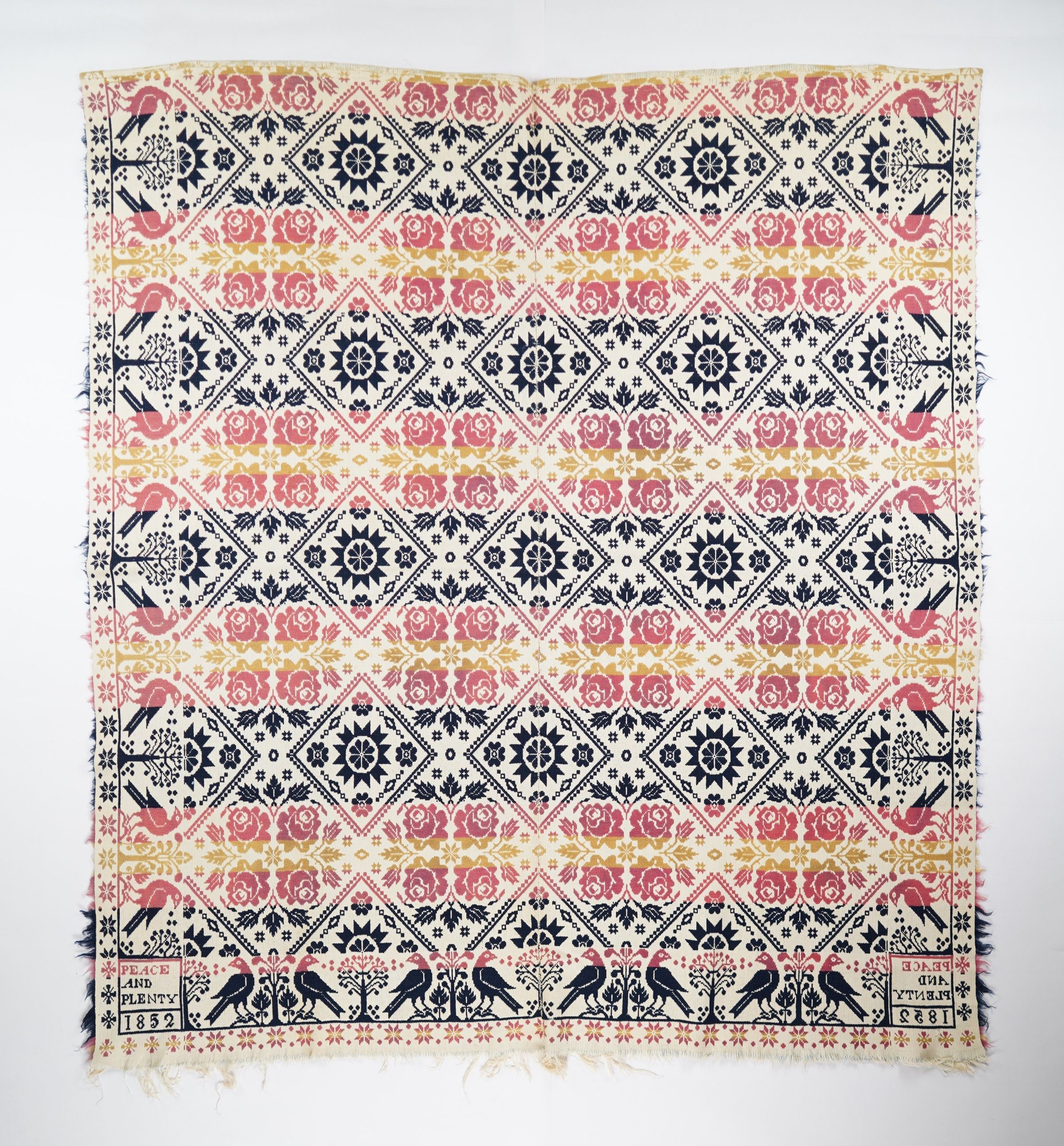 Figured and fancy tied beiderwand coverlet with borders on 3 sides and self-fringe on 3 sides. Two panels joined by a center seam. Navy, red, and yellow wool with undyed cotton. Double rose and star centerfield pattern; alternating bird border on sides and bottom. Attributed to Daniel Arnold, woven in 1852 with Peace and Plenty trademark.Context