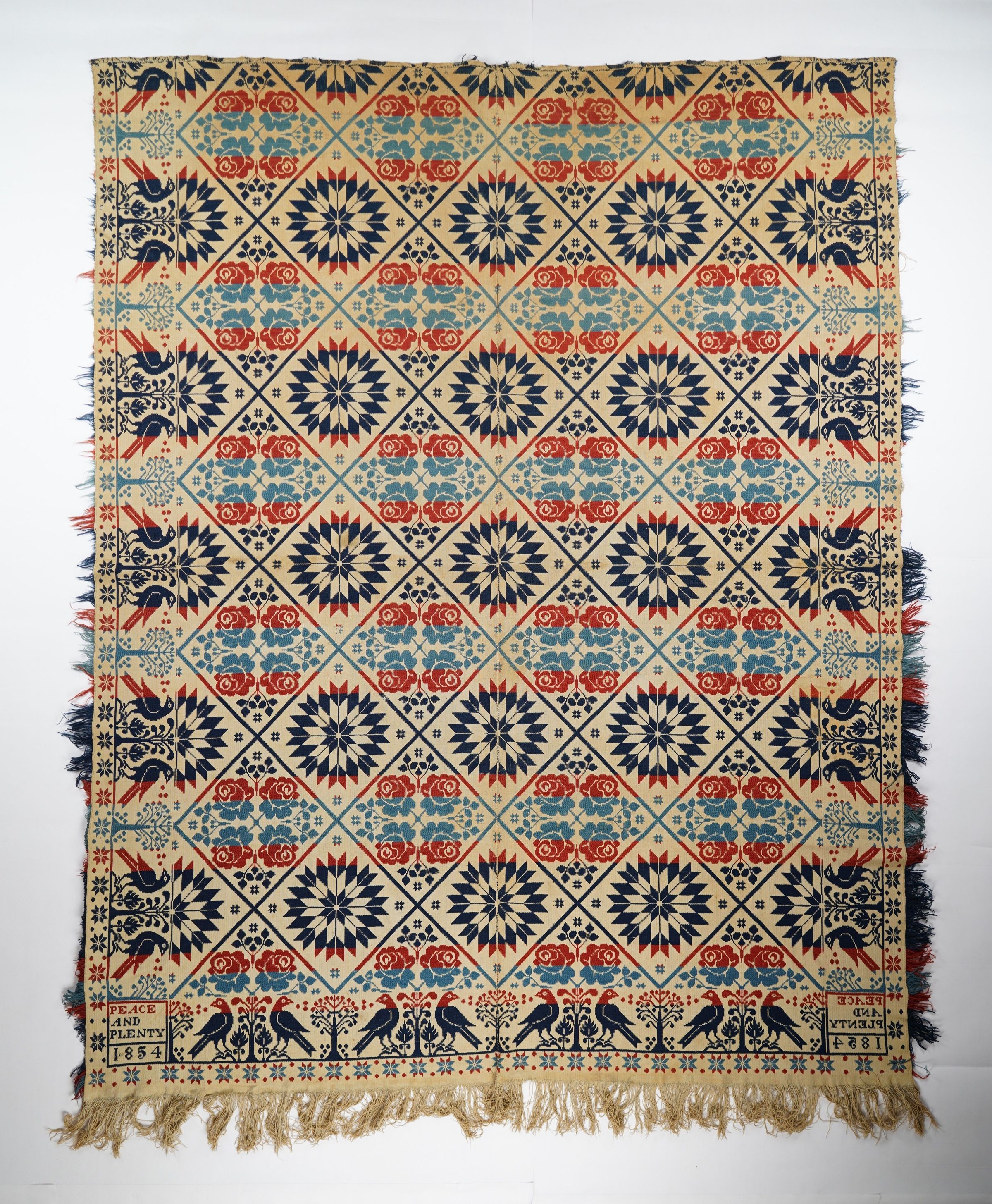 Figured and fancy tied beiderwand coverlet with borders on 3 sides and self-fringe on 3 sides. Two panels joined by a center seam. Navy, red, and light blue wool with undyed cotton. Double rose and star centerfield pattern; alternating bird border on sides and bottom. Attributed to Daniel Arnold, wove in 1854 with Peace and Plenty trademark in cornerblock.Context