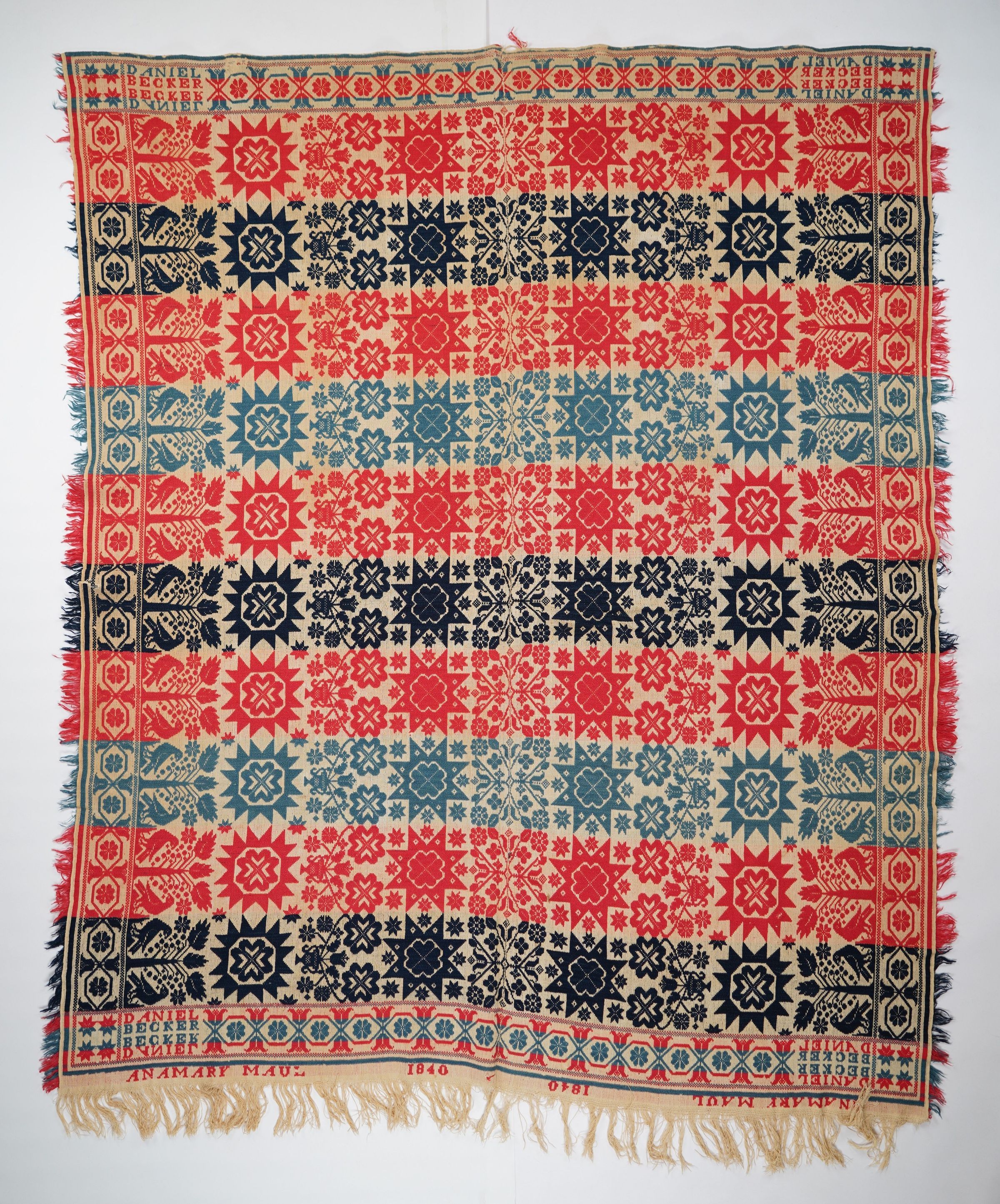 Pennsylvania coverlet by Daniel Baker for Anamary Maul, 1840, tied beiderwandEntry/Object ID