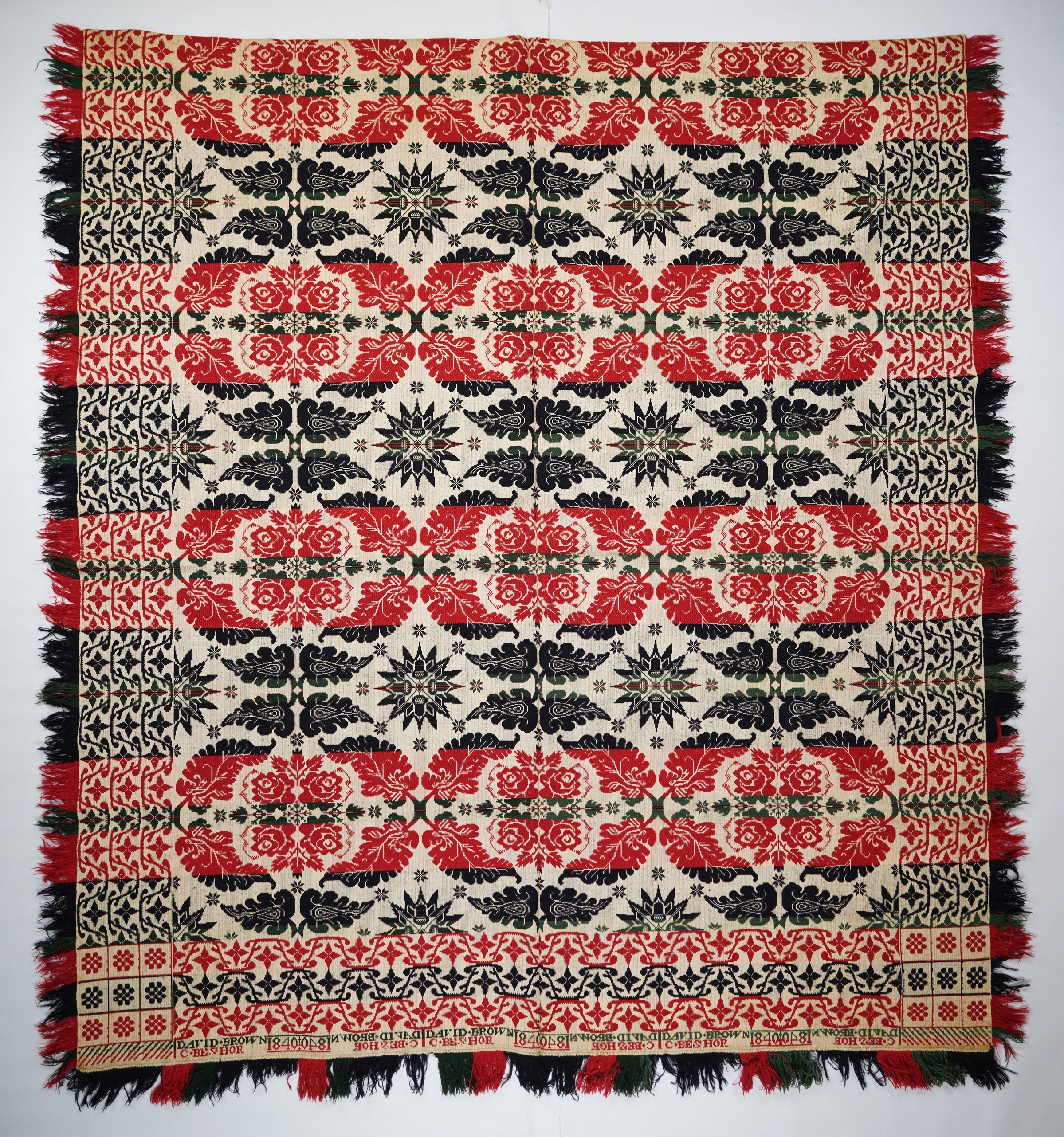 Green, red, navy, and natural figured tied half doublecloth coverlet with border and fringe on three sides. Two joined panels. Woven for C. Beshor by David Brown in Pennsylvania in 1840.Collection
