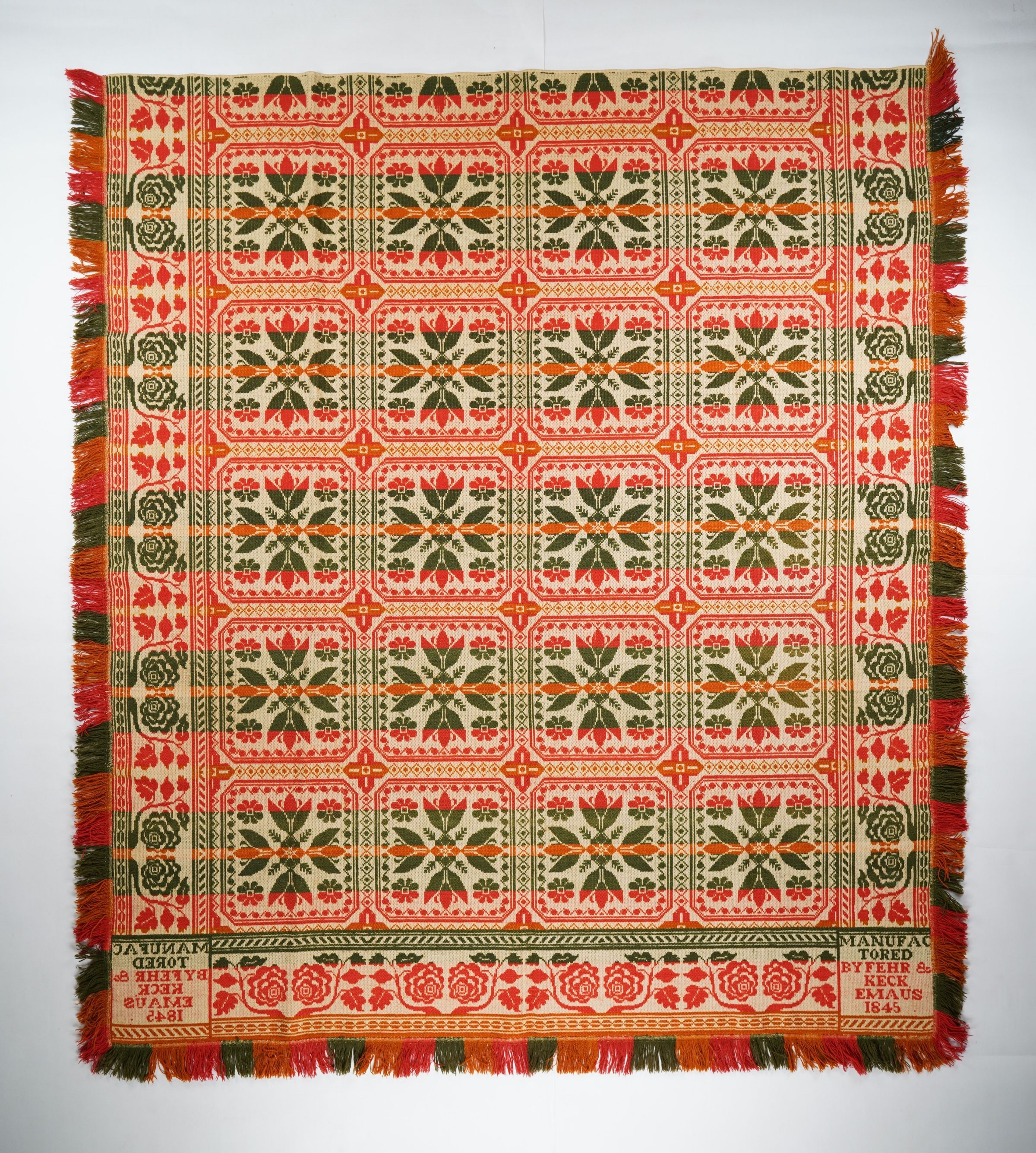 Figured and fancy tied beiderwand coverlet with borders on 3 sides and applied fringe on both sides and bottom. Woven full-width; seamless. Green, red, and orange wool with undyed cotton. Floral tile centerfield pattern; rose vine border on sides and bottom. Woven by Fehr and Keck in 1845.Context